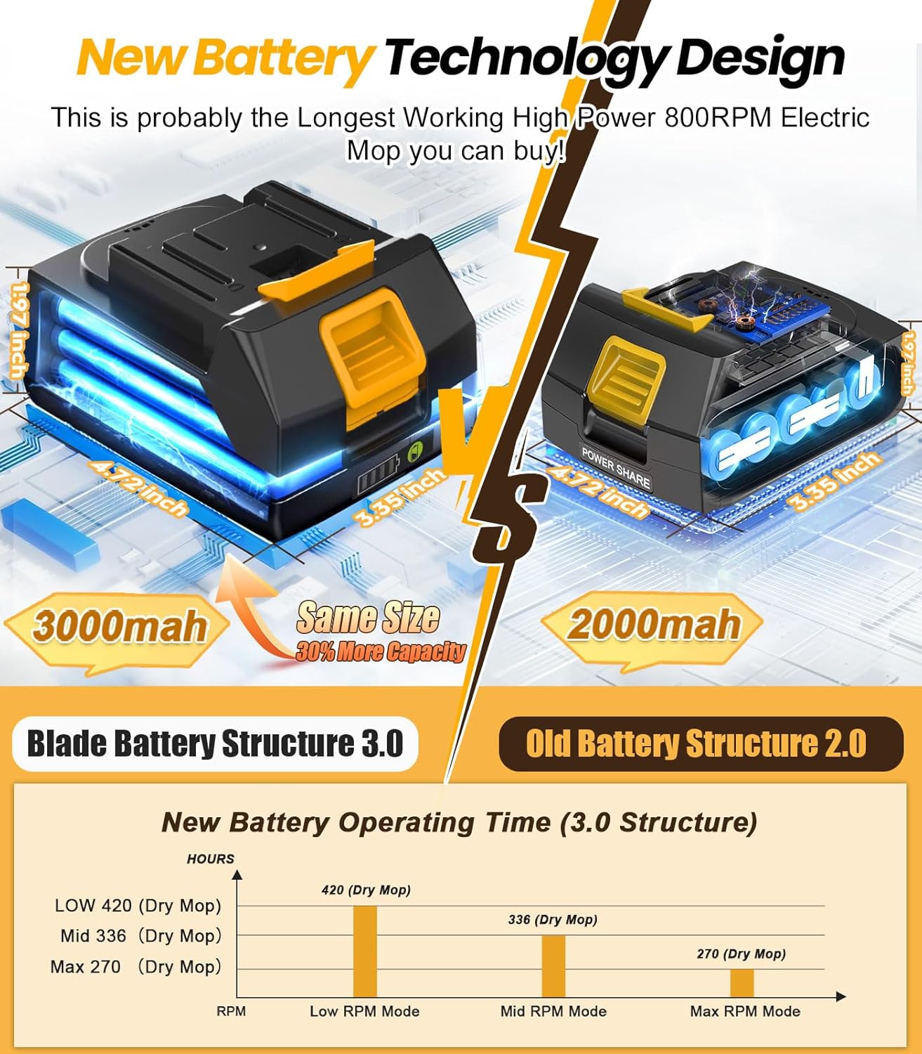 - ใ๐๐๐ฌ๐ญ ๐๐๐ซ๐ญ๐ข๐๐ข๐๐+ 3,๐๐๐๐ฆ๐๐ก ๐๐๐ซ๐ ๐ ๐๐๐ญ๐ญ๐๐ซ๐ฒ ๐๐ง๐ ๐๐ก๐๐ซ๐ ๐ข๐ง๐ ๐ญ๐ข๐ฆ๐ใThis is probably the Longest Working 800RPM power mop you can buy! The latest technology 3.0 blade compression construction battery is the same size and has 30% more capacity compared to the old 2.0 construction battery. 2.5 hours to fully charge,two batteries can work continuously for 420 minutes (low speed mode). Enough time to deep clean floors, bathrooms, and everywhere in your house