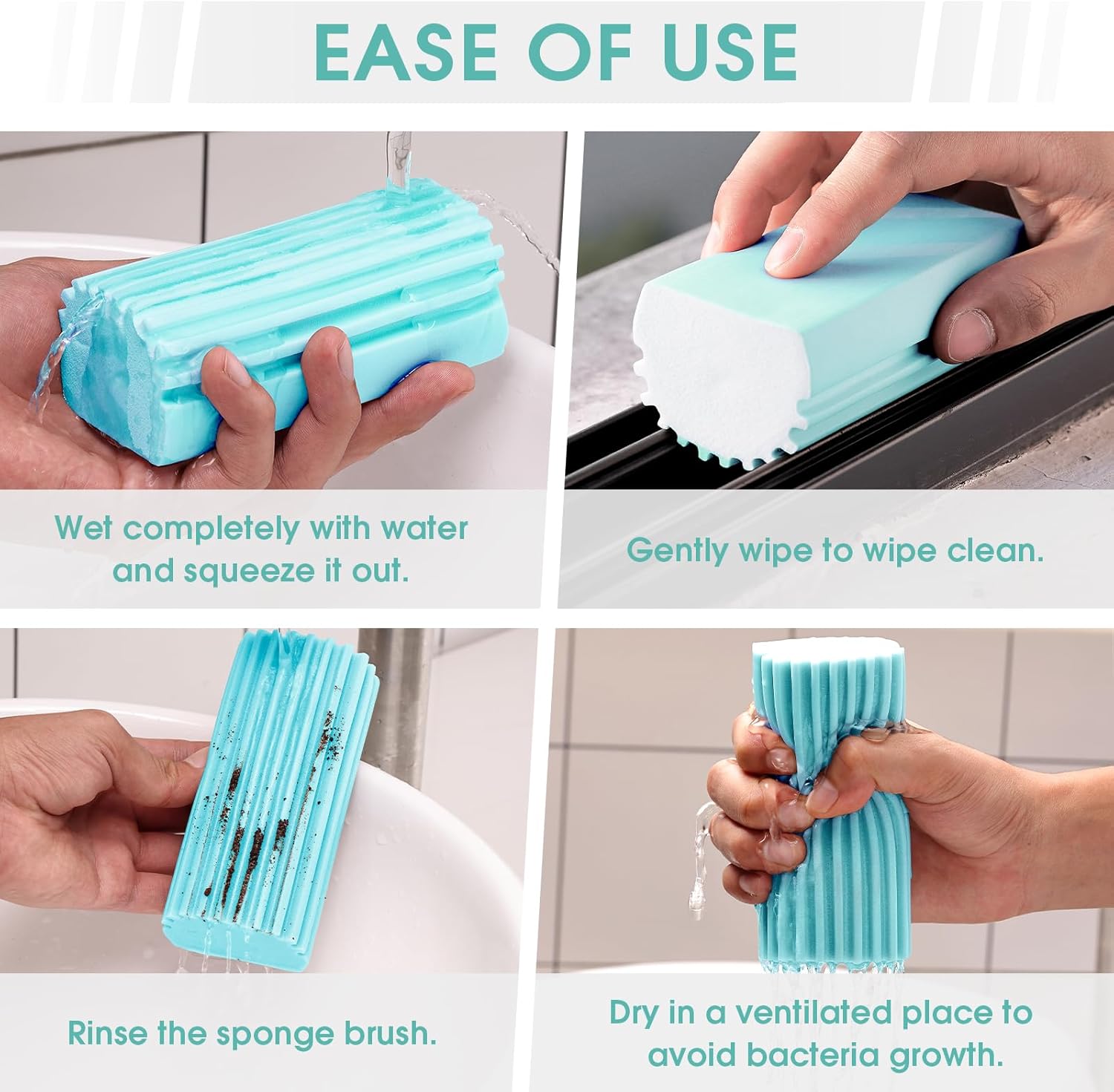 - Multi-purpose: This sponge is ideal for cleaning blinds, baseboards, taps, window track recesses, railings, mirrors, hair, glass, and ceiling fan blades.