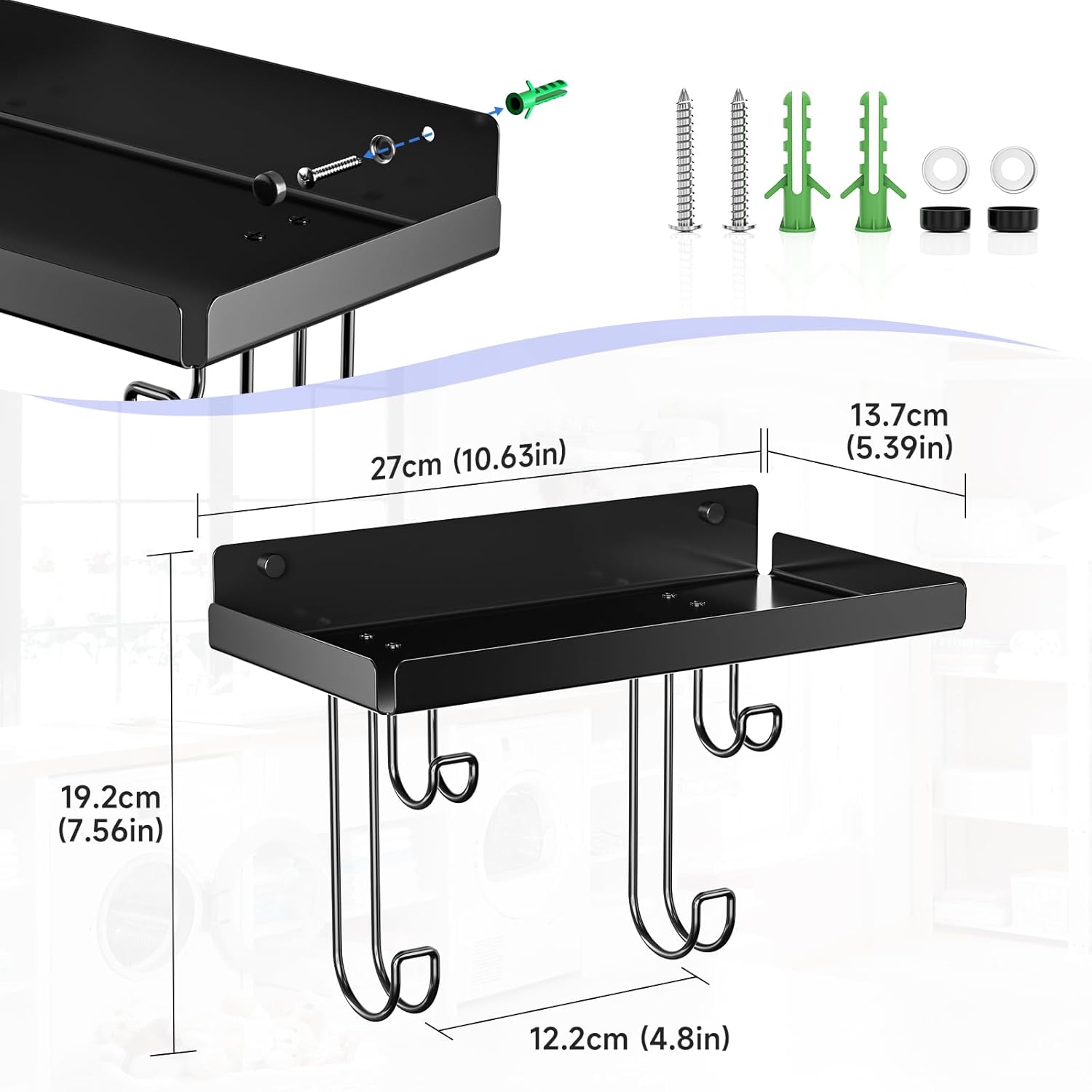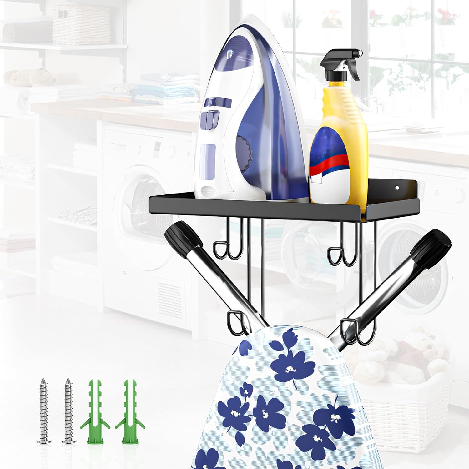 - 【Multi-Purpose Organizer】: Keep your laundry room clutter-free with our iron board holder wall mount! Beyond ironing gear, this iron board hanger transforms any space! Use it in living room (for coats/bags), bathrooms (toiletries), or entryway (scarves/leashes). The top shelf holds daily essentials, while hooks keep items like umbrellas or pet leads tidy.