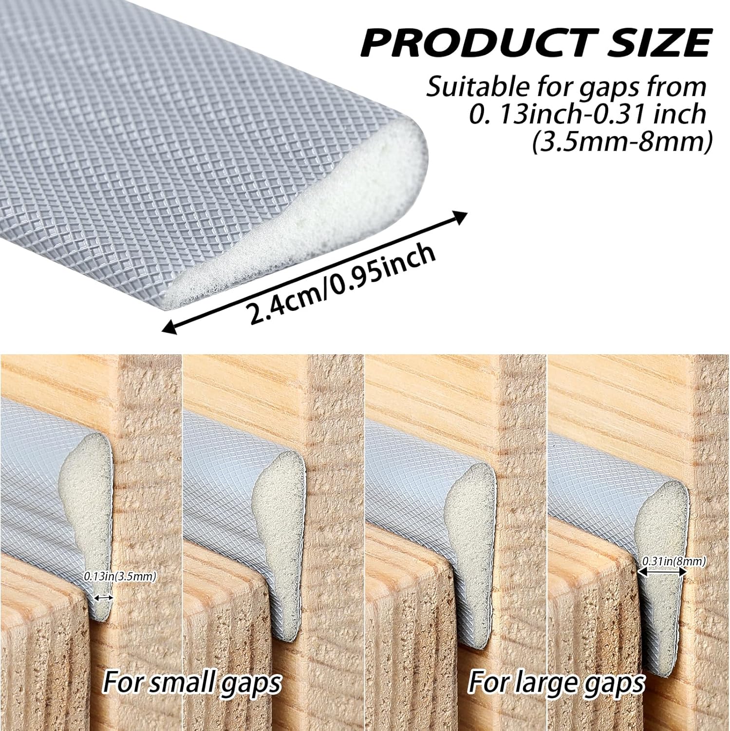 - Adaptable Design: The unique wedge-shape, with a wide edge of 9.5mm (0.38 inches) and a narrow edge of 2.5mm (0.1 inches), allows it to fit snugly into gaps ranging from 3.5mm to 8mm (0.13-0.31 inches). This flexibility ensures a perfect seal for any door or window frame