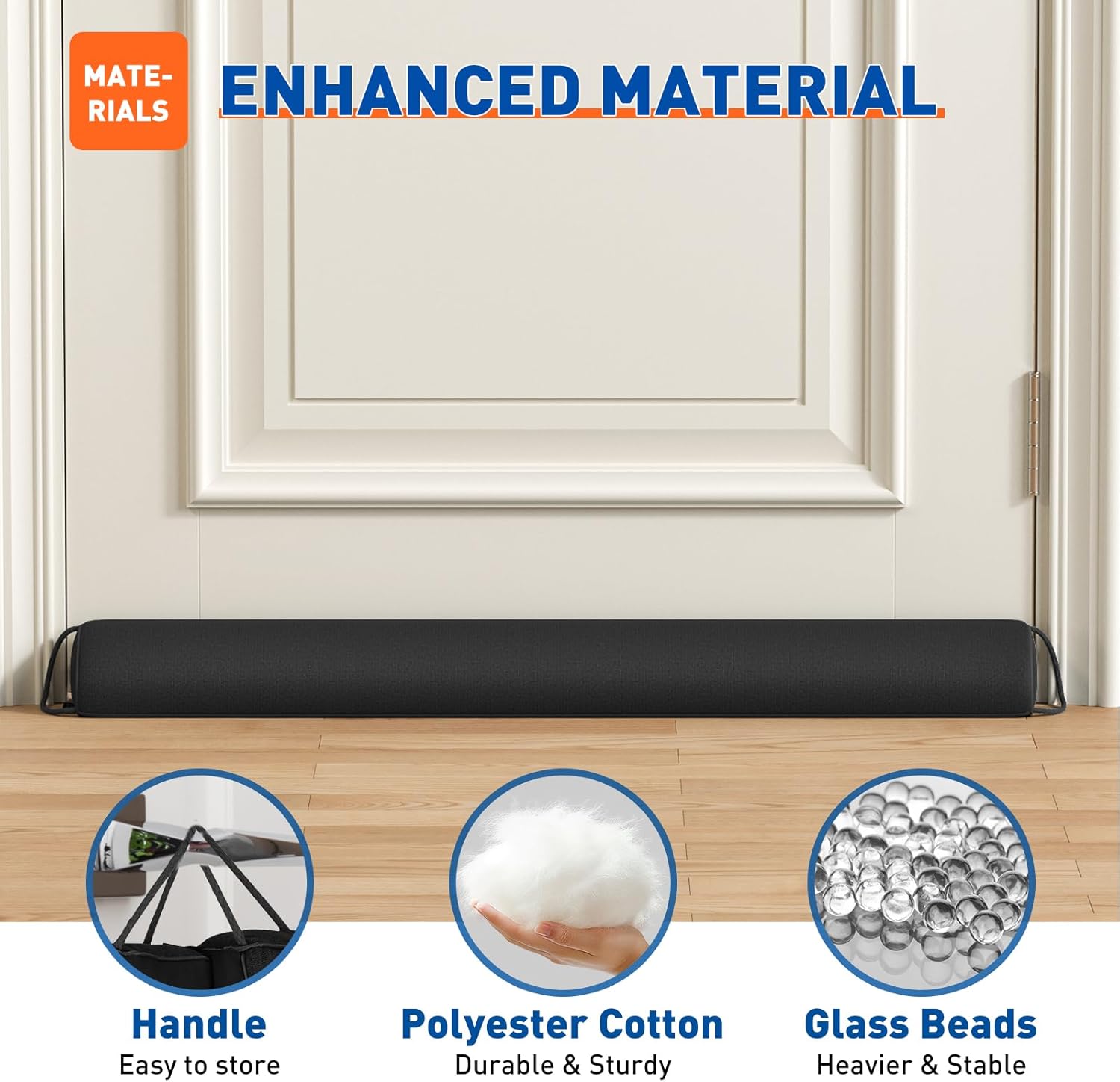 - ENHANCED MATERIAL – This under door draft stopper is made with soft cotton and filled with glass beads for added stability, improving thermal, soundproof and dustproof performance. It weighs 2.18 lbs and fits the door snugly.
