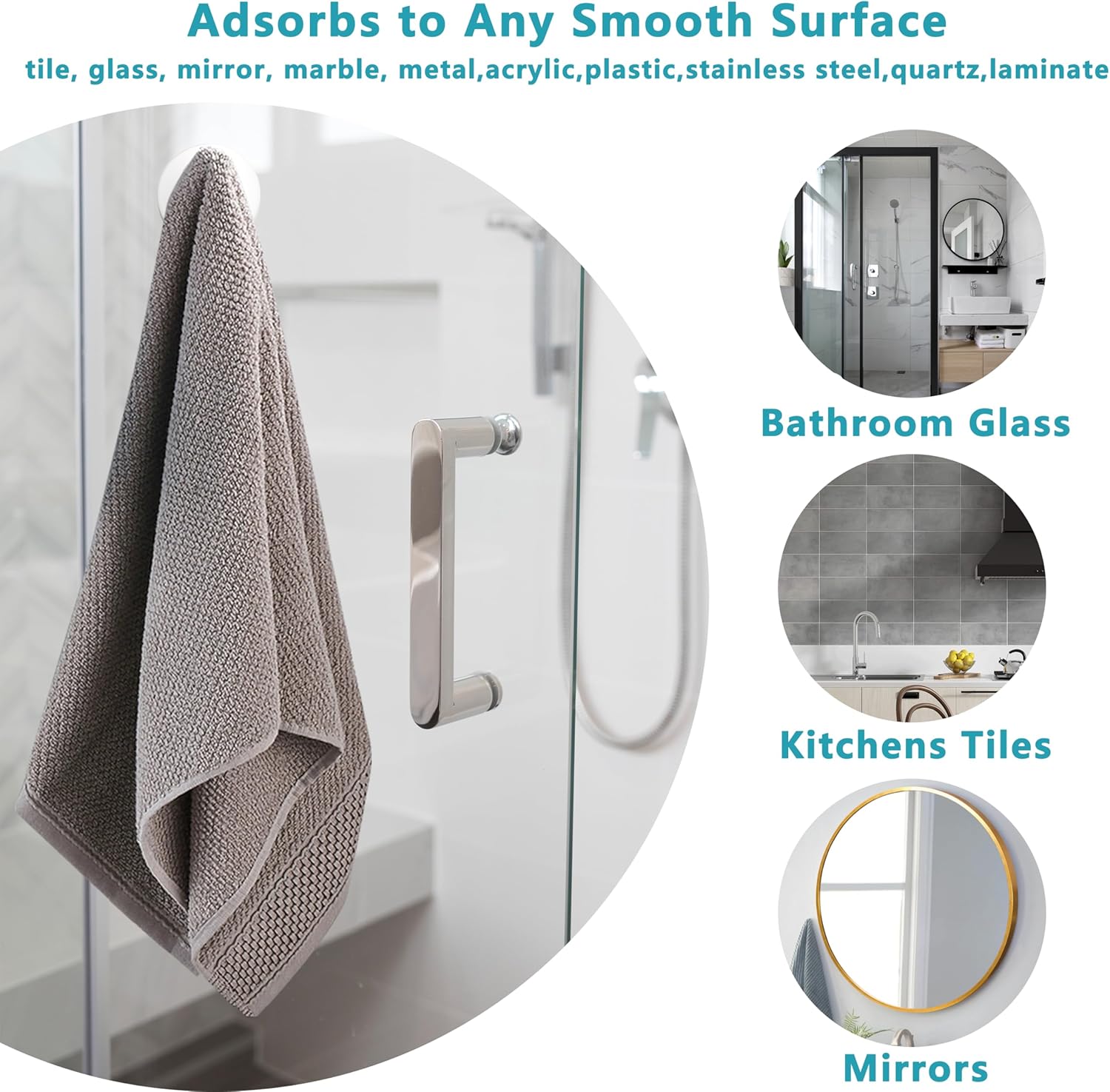 - 【Hangs Securely on 10+ Materials】The suction cup hooks are suitable for bathrooms,kitchens,windows.it can be fixed to fit tile, glass, mirror, marble, metal,acrylic,plastic,stainless steel,quartz,laminate and other smooth wall surfaces.it can hang towels, loofahs, bathrobes, coats and other items up to 15 lbs
