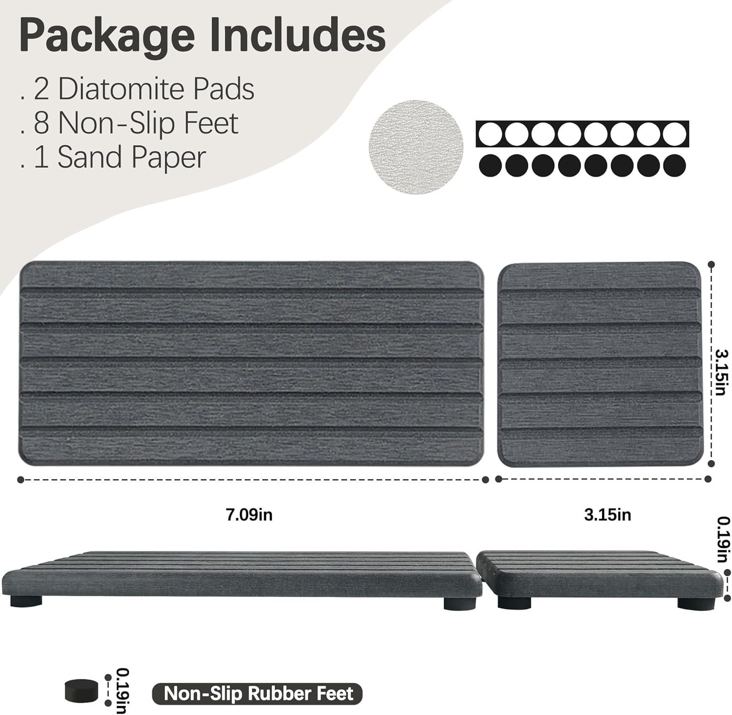 - Striped ditch design speeds up the absorption and volatilization of water, and has anti-skid effect.Silicone footpads boost the slip-resistance of coasters while keeping them out of the bathroom vanity. This design improves the contact surface between the diatomaceous earth coaster and the air, prevents moisture, and prolongs the service life of the product.