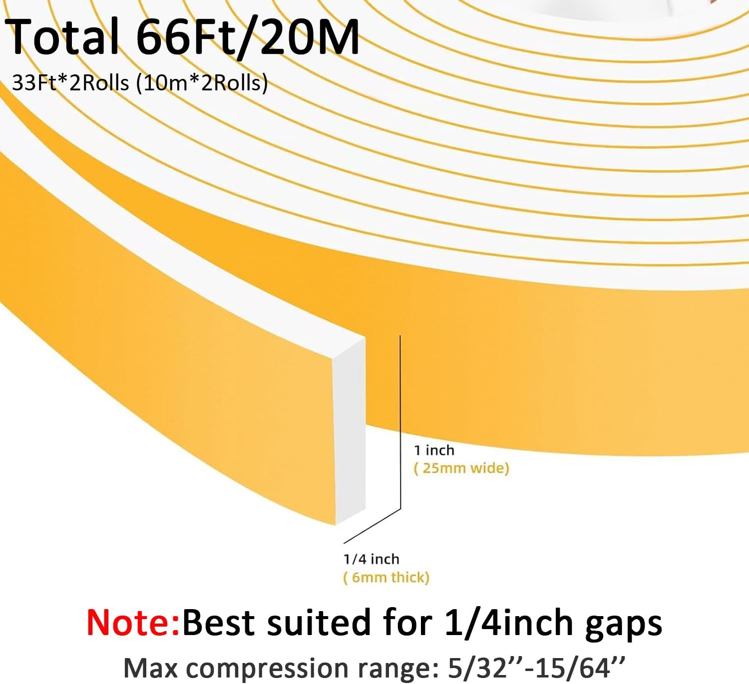 High Density Foam Weather Stripping Door Seal Strip Insulation Tape Roll for Insulating Door Frame, Window, Air Conditioner Soundproof Self Adhesive Sealing Weatherstrip(1 in x 1/4 in x 66 Ft)