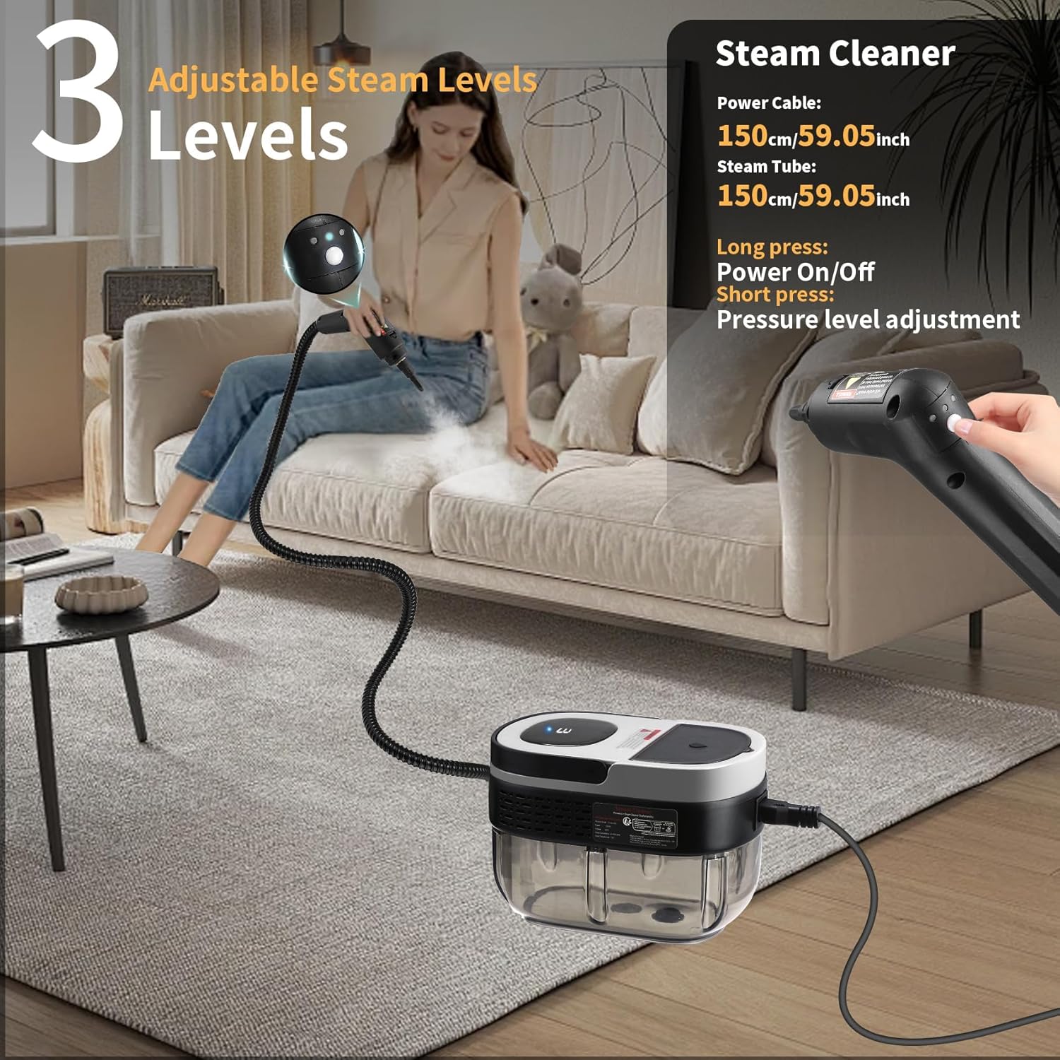 - 【3-level Adjustable Knob】The handheld steam cleaner features a 6-level adjustable knob, allowing you to fine-tune the steam intensity to suit a variety of daily cleaning tasks. Additionally, it delivers approximately 3 bar of high-pressure steam, with the capability to heat up and release high-temperature steam in just 10 seconds, effectively loosening and dissolving dirt for efficient cleaning