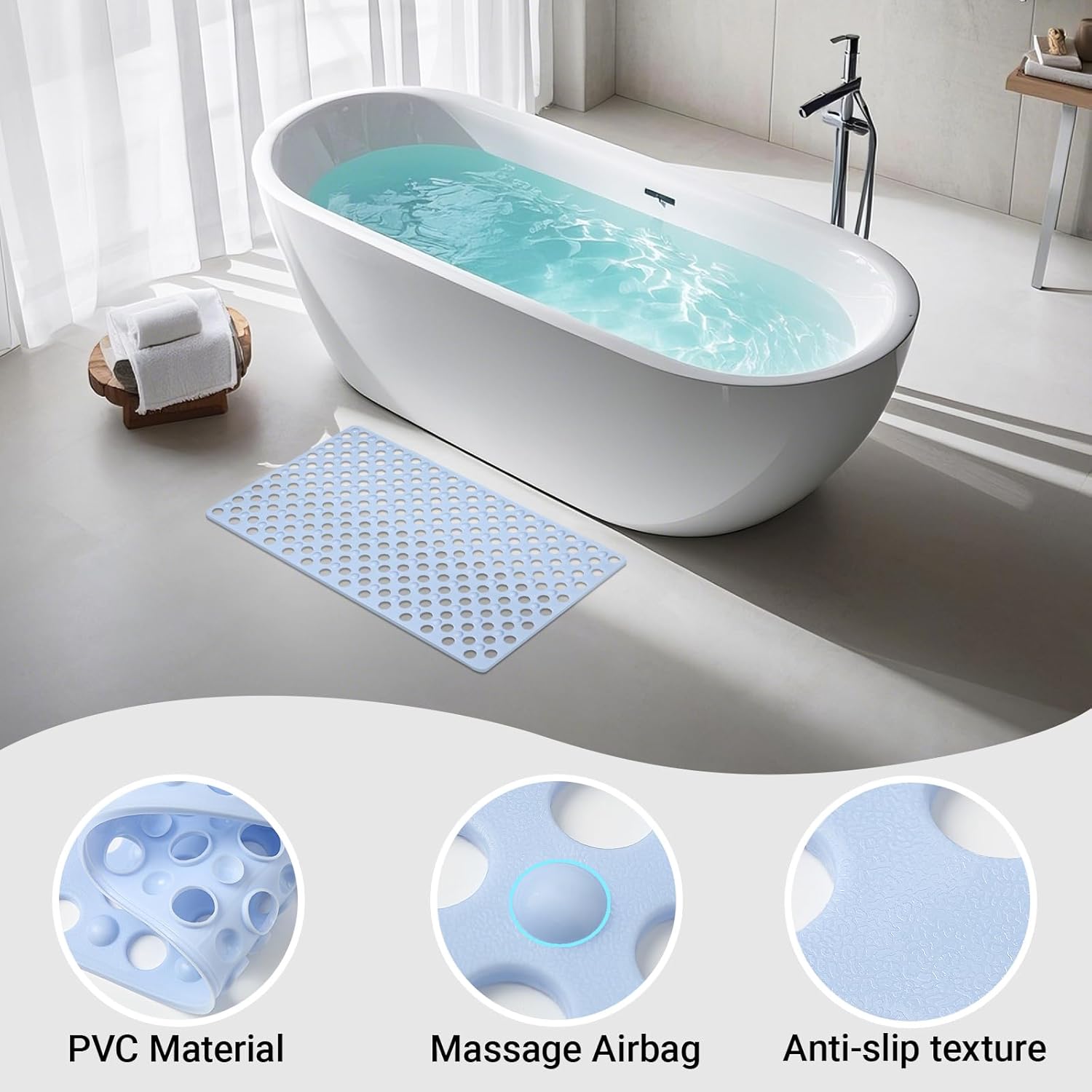 Non Slip Bathtub Mat and Shower Mat 31x17 inch,Bath Mat with Quick Dry Drain Holes and Suction Cups, Soft Comfortable Safe Bathroom Mat for Bath Tub, Floor, Tile (Light Blue)