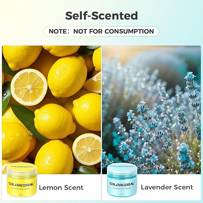 - 【Two scents】ColorCoral Cleaning Gel is made of blue lavender scent, yellow lemon scent flavor, 2-piece combination, non-sticky, non-irritating to the skin, put it in the car can also cover up other odors, it is a must-have for your car. When the child cries in the car, you can use it as a toy, it is a good stress reliever toy (Note: not edible)