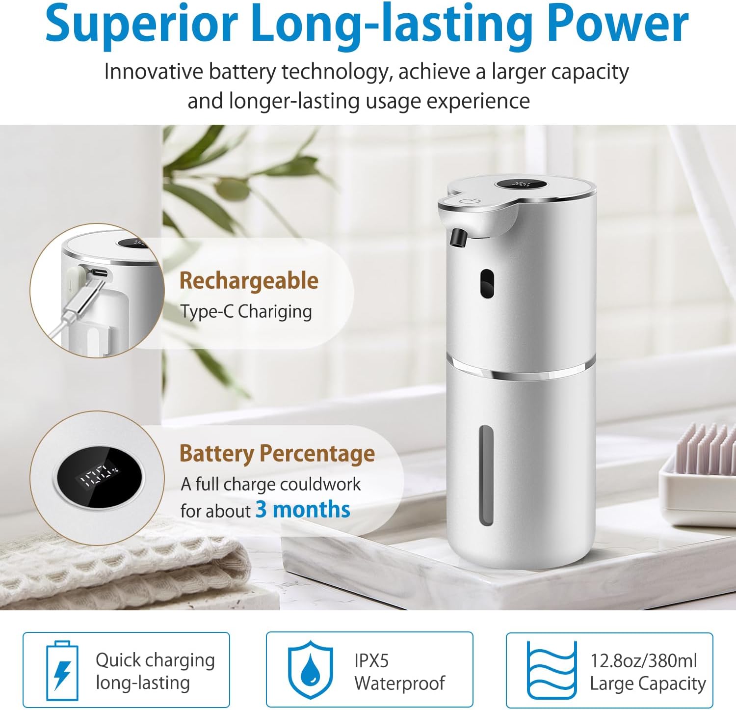 - 【Large Capacity & IPX5 Waterproof】Our touchless soap dispenser boasts a spacious 12.8oz capacity, minimizing the need for frequent refills. The translucent container allows for easy monitoring of soap levels, while the wide-mouth design simplifies refilling. With an IPX5 waterproof rating, it ensures durability and longevity, even in wet environments