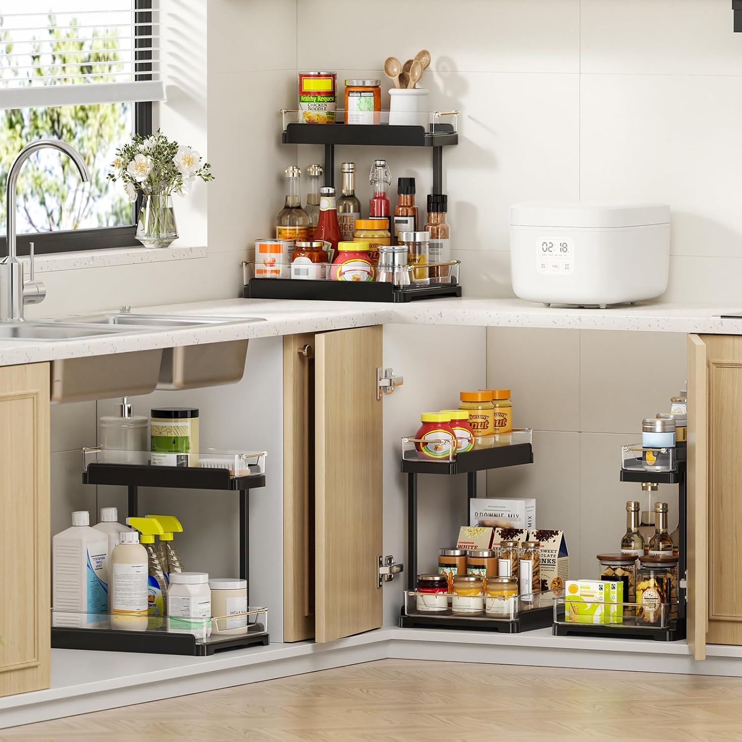 heart & home 2-Pack Under Sink Storage Organizer for Kitchen & Bathroom Cabinets with Removable Washable Tray, Tool-Free Assembly – Multi-Purpose for Vanity, Laundry & Countertop, Black