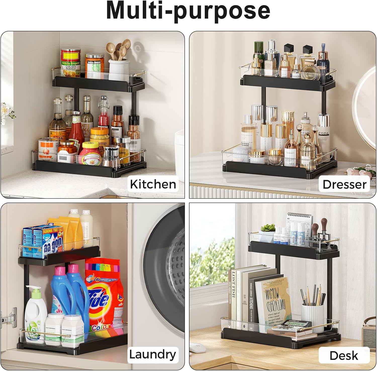 - 【Multi-Space Fit】 Under sink storage organizers are perfect for kitchens, bathrooms & laundry rooms. Fits seamlessly into under sink, cabinet, countertop, pantry, and tight space to double storage instantly