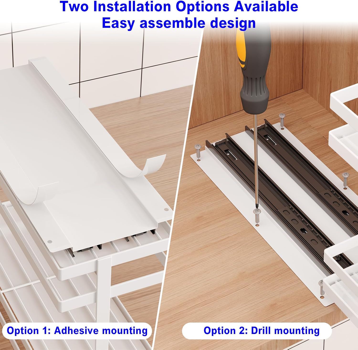 - 【Easy to Install & No Assembly】We offer two installation options: 3M Adhesive strips and drilling mounts. With the adhesive strip option, peel off the adhesive film and adhere it to any applicable surface. For those opting for drilling, we provide all the necessary screw accessories. Our products are designed to require no assembly. You can install them directly into your cabinet after opening the package. It only takes one minute to complete.