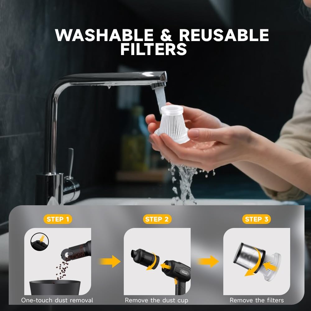 - Washable & Reusable HEPA Filters :The cordless portable car mini vacuum is equipped with high-quality HEPA filters that ensures thorough cleaning by effectively trapping dust and particles. And the one-click dust emptying design allows for simple and hygienic disposal of debris, keeping your hands clean