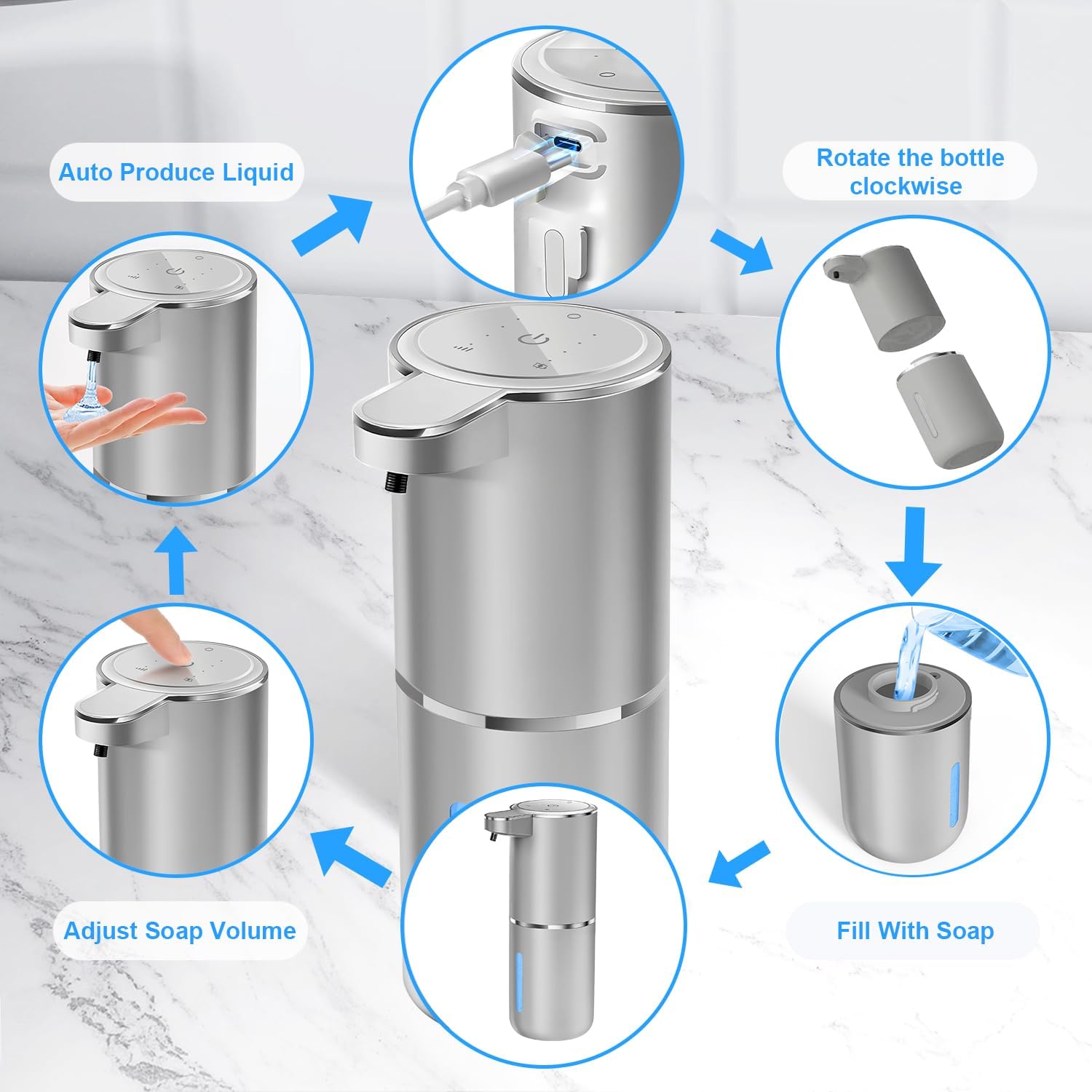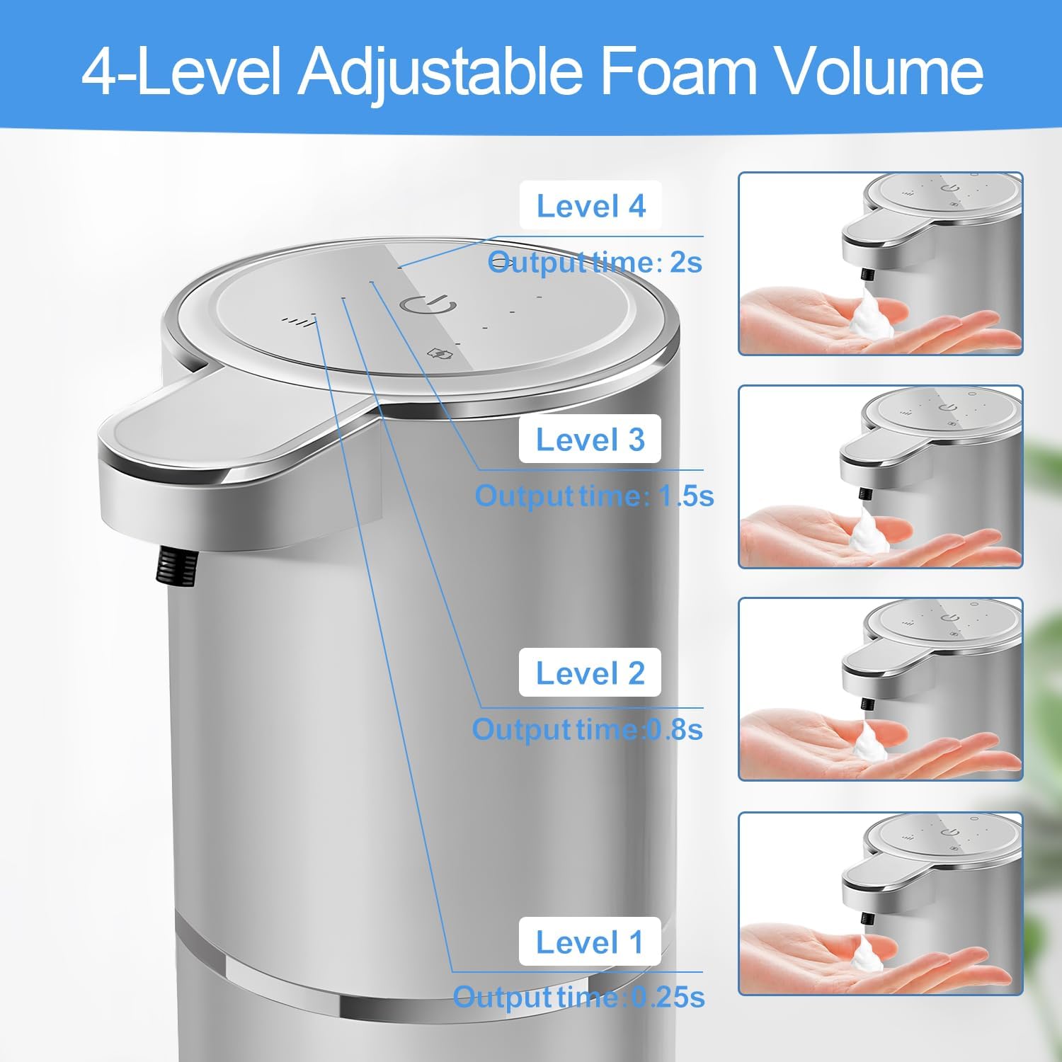 - 🌻【4-Level Foaming Soap Volume Adjustable】-- There are 4 different Foaming soap dispenser settings for options, only by touch the power button once to adjust the soap volume ( And keep pressing the power button for 3seconds to turn on/off the dispenser ). The soap volume weight is 0.5g / 1.5g / 2.4g / 3.2g (Base on each level of soap volume setting) .