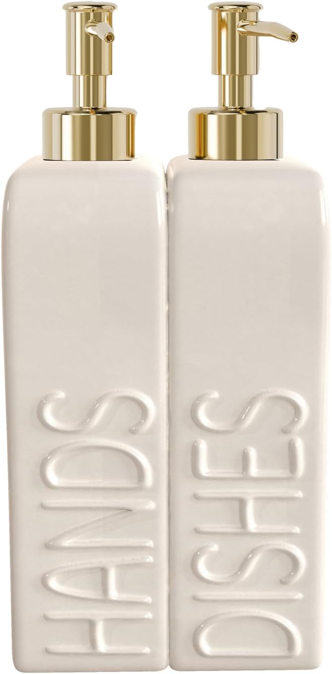 - Stylish Soap Dispenser Set: Includes two ceramic pump bottles embossed with “HANDS” and “DISHES”, perfect for organizing soap and adding a decorative touch to your kitchen or bathroom sink area