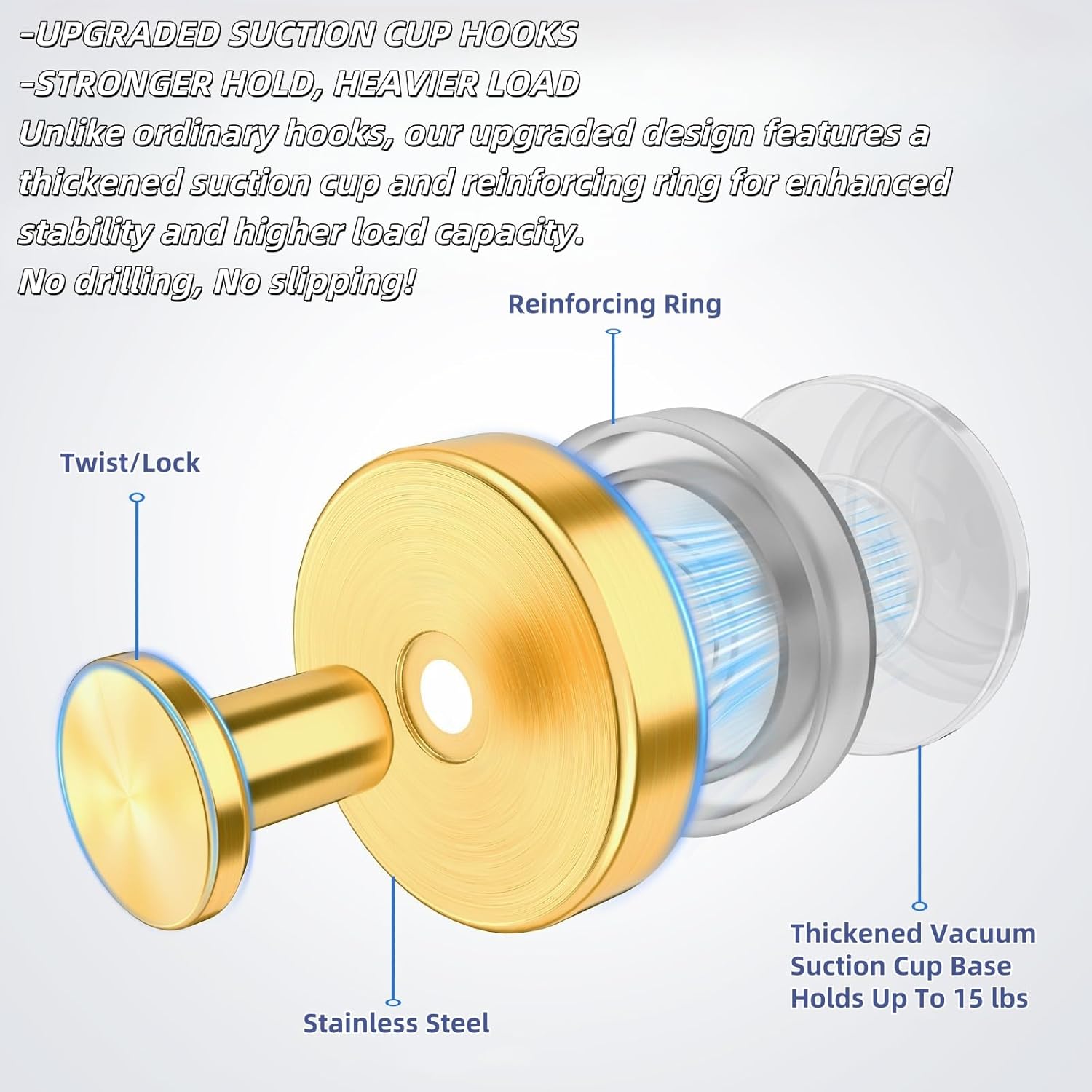 2025 Upgraded Stainless Steel Heavy Duty Suction Cup Hooks for Shower Bathroom Accessories Removable Hook for Glass Window Door Wall Hooks for Hanging Towels Robes Wreaths (Pack of 5, Gold)
