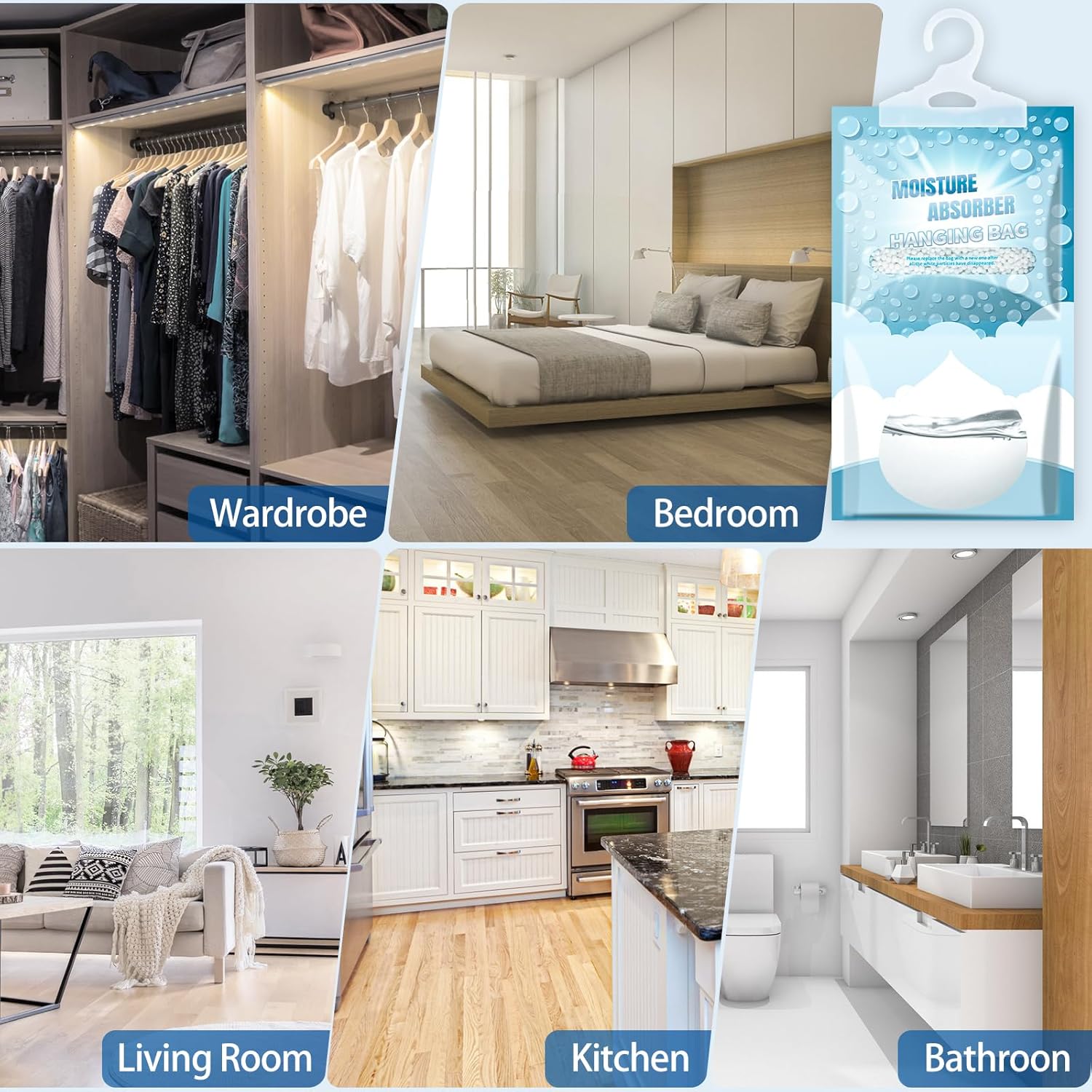 - 【Wide Use】The dehumidifier packagings is compact, making it easy to carry and store. This hanging dehumidifier bag is suitable for every space including closets, bedrooms, bathrooms, kitchens, basement. To effectively control humidity, you can adjust the number of dehumidification bags according to the size and humidity of each room.