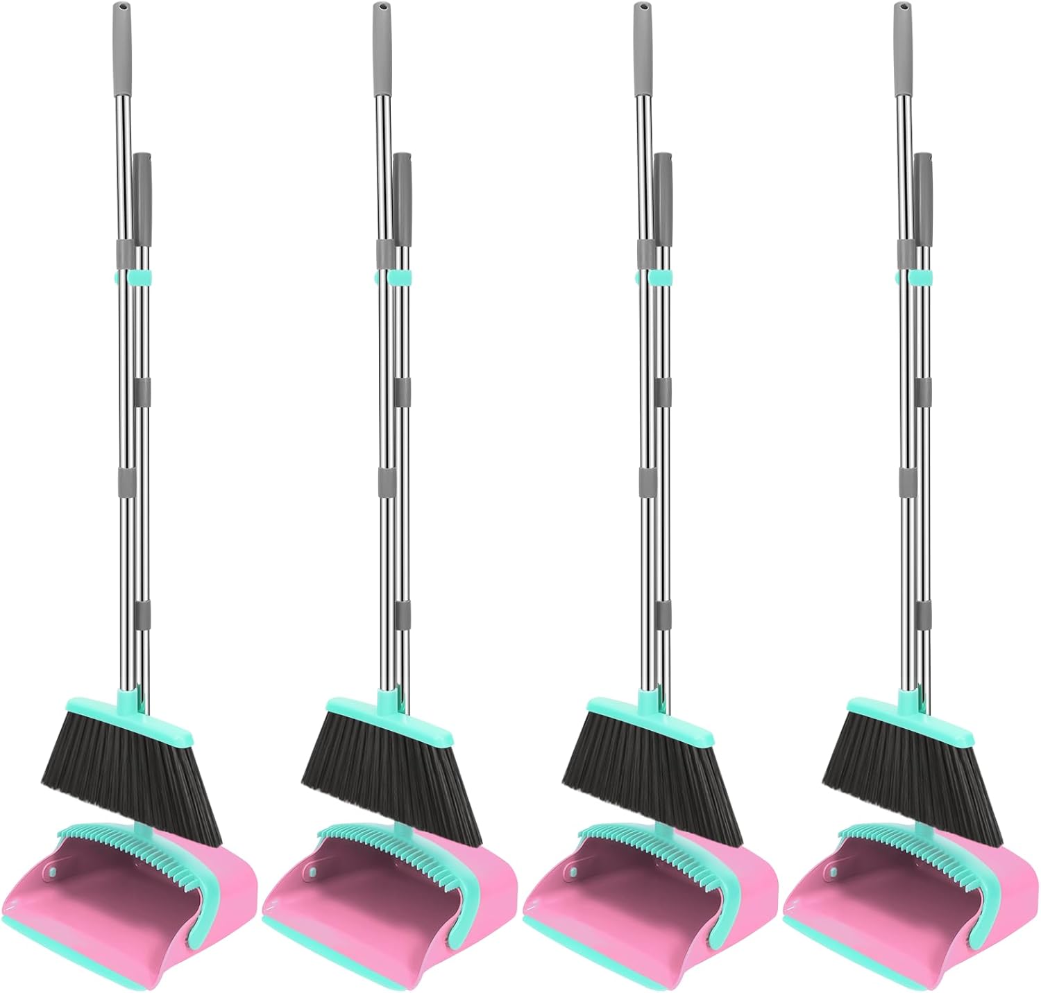NACENA Broom and Dustpan Set, 52-in Long Adjustable Handle Broom Dustpan Combo with Dustpan Teeth to Automatically Clean Hair Suitable for Home Kitchen Office Hall Floor (Pink&Blue), 4 Pack