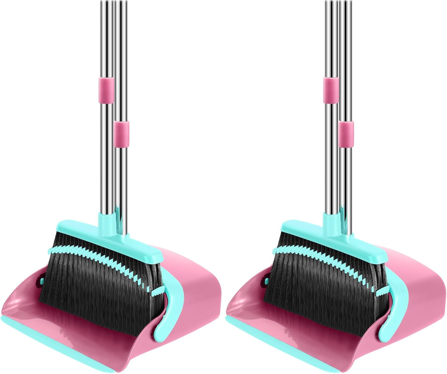Broom and Dustpan Set, 52-in Long Adjustable Handle Broom Dustpan Combo with Dust pan Teeth to Automatically Clean Hair Suitable for Home Kitchen Office Hall Floor (Pink&Blue), 2 Pack