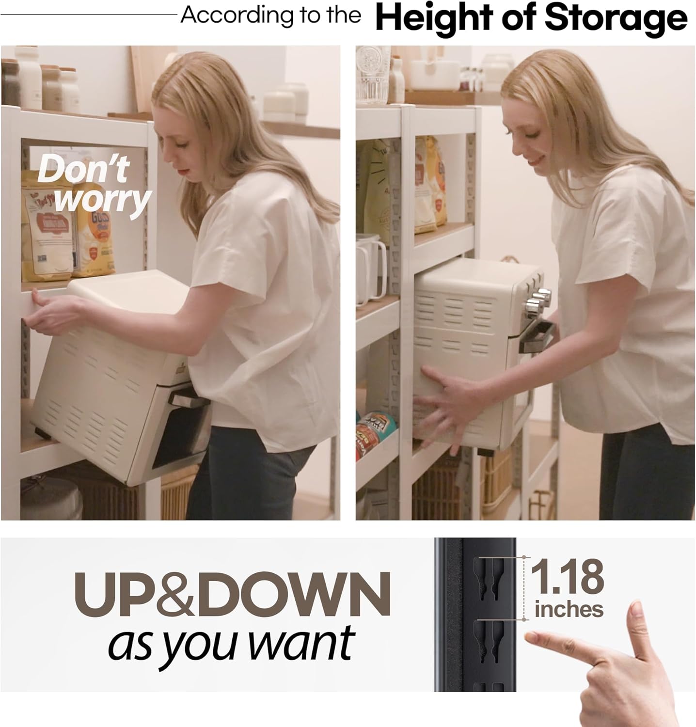 - EASY TO ASSEMBLE & HEIGHT ADJUSTABLE - You don't need any parts as plastic clips like wire shelving. You just slide and fix the frame in the post hole (a Mallet is a giveaway). Once it is put together, it can create a great deal of additional storage space without taking up too much space. Each tier can be freely adjusted the shelf up and down by the size of the item, as the hidden secret holes inside the post have grooves 1.18 inches apart. So can create customized storage space.