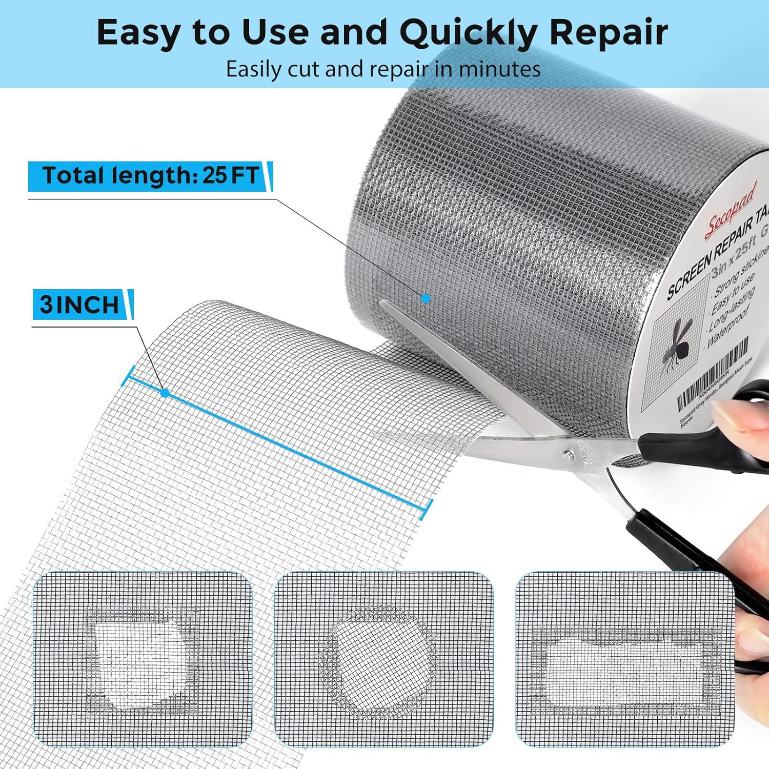 - Easy and Fast: Cut a suitable size or shape of the screen repair tape, then cover the tear or hole you want to repair. No tools needed and only seconds you're done! Fast and easy way to repair screens temporarily or permanent