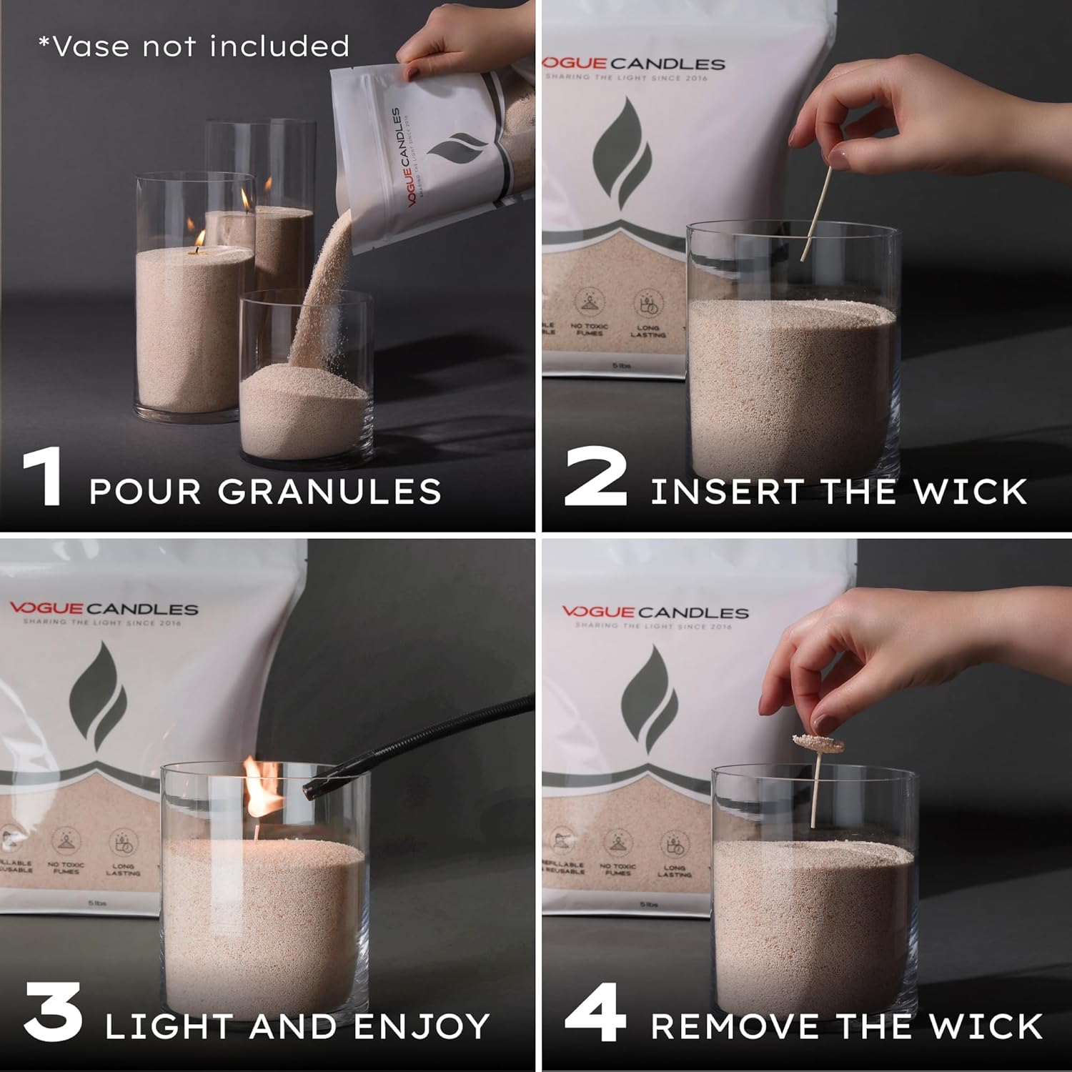 - Create a Candle, Your Way. No Mold, No Mess: Our signature plant based granules turn any vase or vessel into a stunning candle. Each 1LB kit includes 15 clean-burning cotton wicks. Each 5LB kit includes 50 wicks for extended use or gifting. Just pour to 2/3 full, insert a wick vertically, and light. No wax pouring or molds required. Every setup is unique, every candle is yours.
