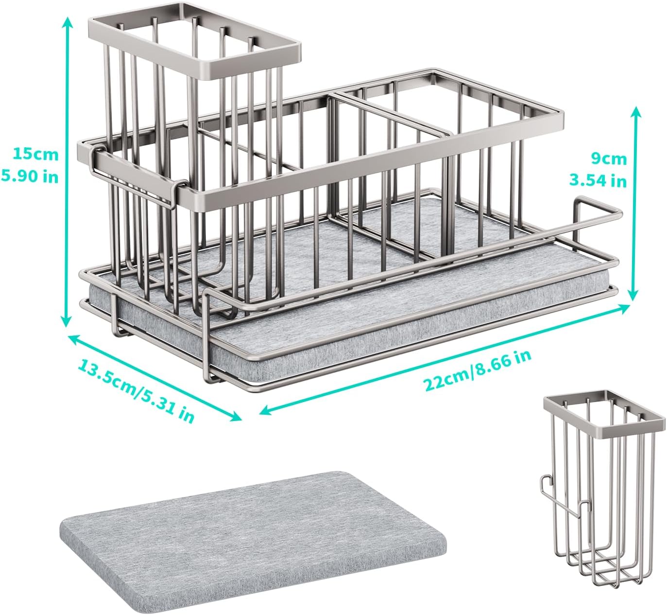 - [Anti-slip Kitchen Caddy]: We know many customers will worry about instability of kitchen sponge holder. Therefore, our kitchen sink accessories added non-slip rubber feet. No need to worry about sliding and stability of this sponge caddy