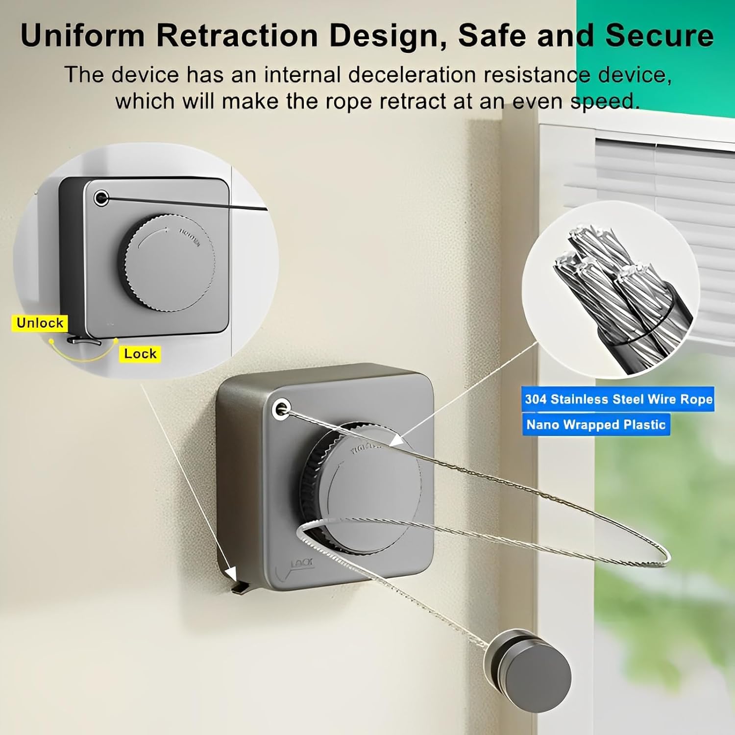 - 【Premium Material】The laundry line is assembled with a high-quality ABS box, space aluminum mounting base and 304 stainless steel line. The stainless steel wire features a nano-coated surface that effectively prevents scratches to the hands, waterproof, rust-proof, and sun-proof. Whether indoor or outdoor, our YUSHIYAN clothesline is a great choice;