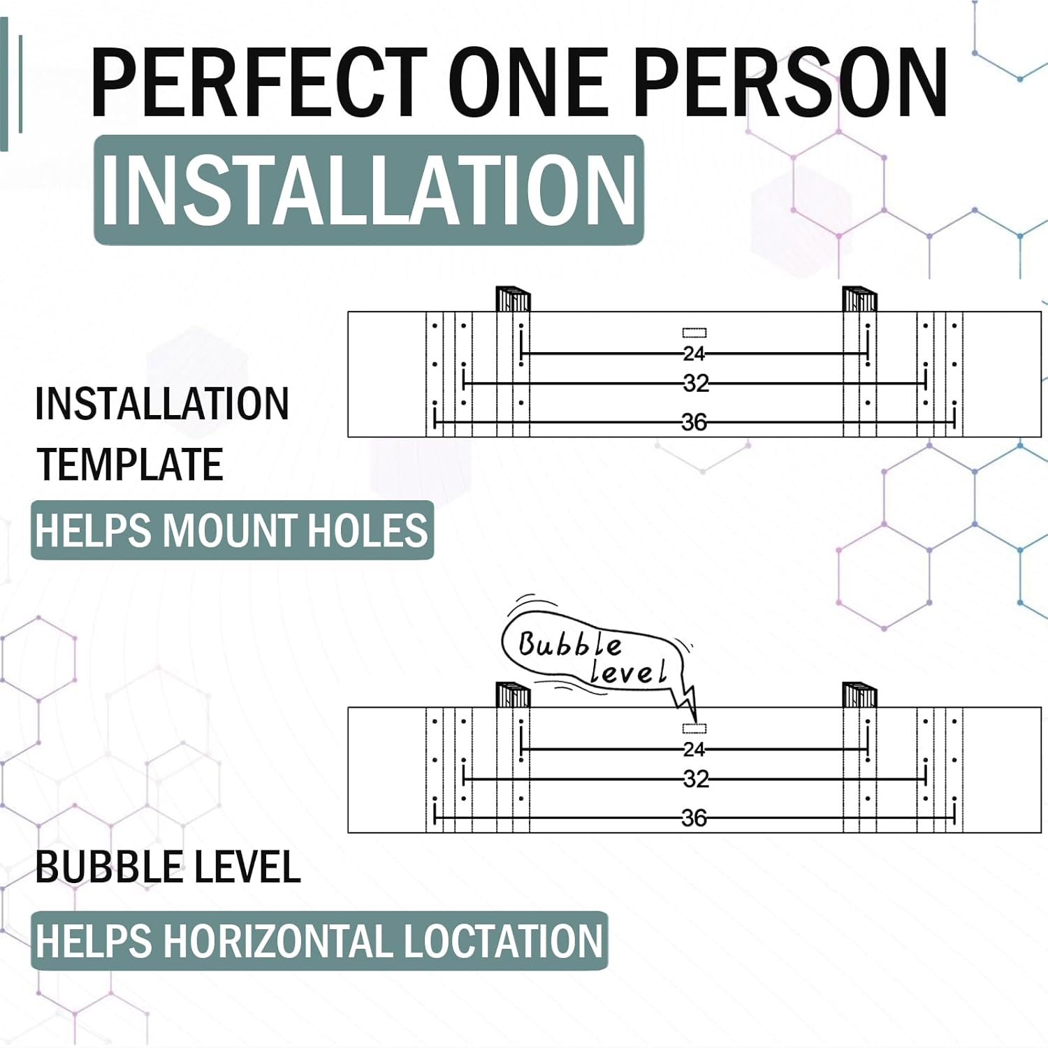 - 【Quick – Secure Setup】: Easy one-person installation with all hardware included: Installation Template helps mount holes; Bubble Level helps get perfect horizontal location.