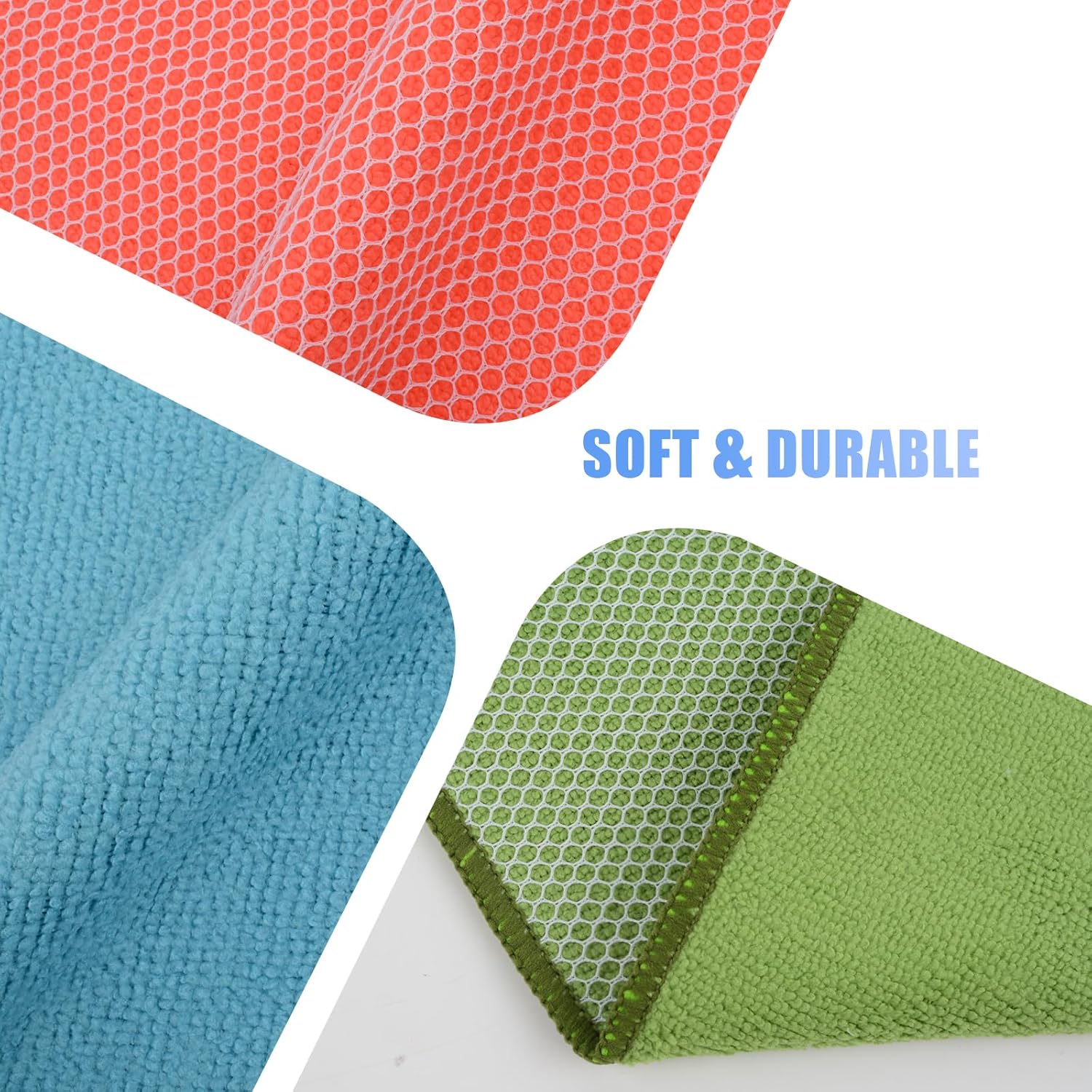 - DISH RAGS FOR KITCHEN CLEANING WITH POLY SCOUR SCRUBBING SIDE: One side is microfiber and the other side is mesh. The microfiber side works well at getting finger spots off the stainless steel appliances and the glass front of fridge or stove, microwave; the scrubby side is good for cleaning stuck on food without having to grab your scraper and does not scratch delicate surfaces either