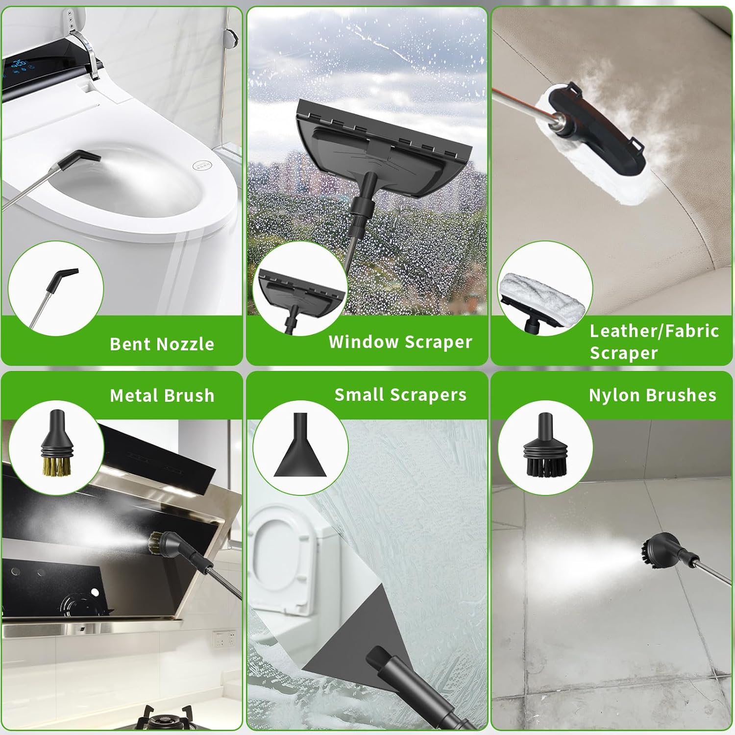 - Versatile 15-Piece Accessory Kit: Includes 2 nylon and 1 brass brushes, 2 nylon nozzles, 2 flat scrapers, 1 window scraper with towel cover, 1 extended nozzle, 2 gloves, 1 needle for cleaning scale, 1 wrench and 1 storage bag. This cleaning steamer kit is perfect for cleaning kitchen grease, car interiors, glass, grout, and more