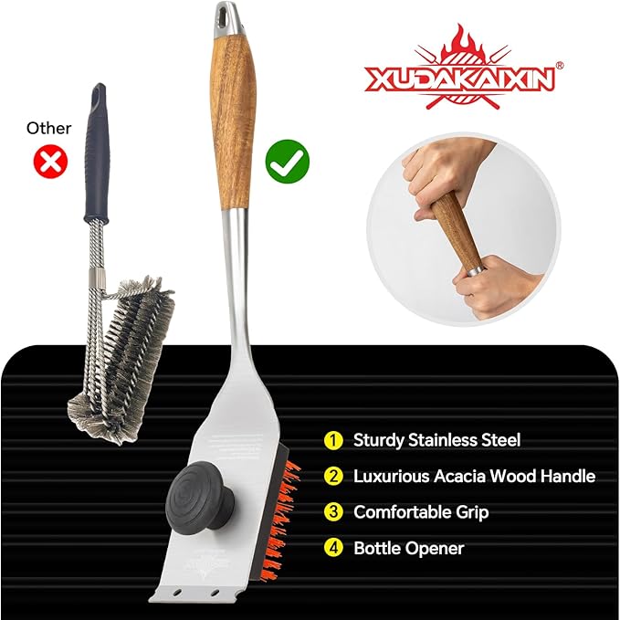 - 【 Comfortable and Sturdy Acacia Wood Handle】Designed for precision and ease, the ergonomic Acacia wood handle offers a secure, comfortable grip, making this brush as practical as it is visually appealing-an essential premium tool for any grilling enthusiast
