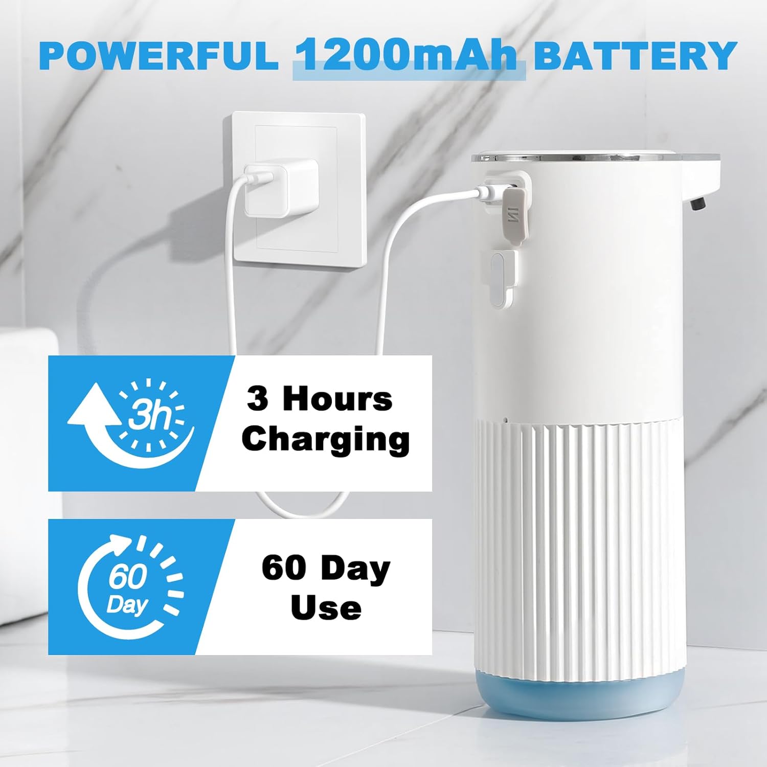 - 【IPX5 WATERTIGHT & EXTENDED BATTERY LIFE】Engineered with IPX5-rated watertight, this auto soap dispenser touchless withstands splashes in damp environments like sinks or showers. A secure rubber seal safeguards the charging port in humid conditions. The integrated 1200mAh battery supports up to 60 days of daily use on a single USB-C charge—no frequent recharging needed.