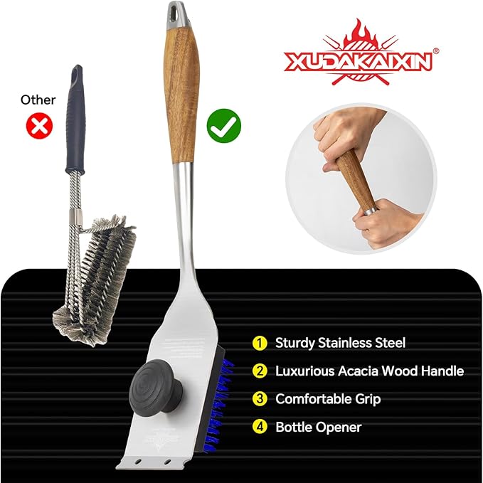 - 【 Comfortable and Sturdy Acacia Wood Handle】Designed for precision and ease, the ergonomic Acacia wood handle offers a secure, comfortable grip, making this brush as practical as it is visually appealing-an essential premium tool for any grilling enthusiast