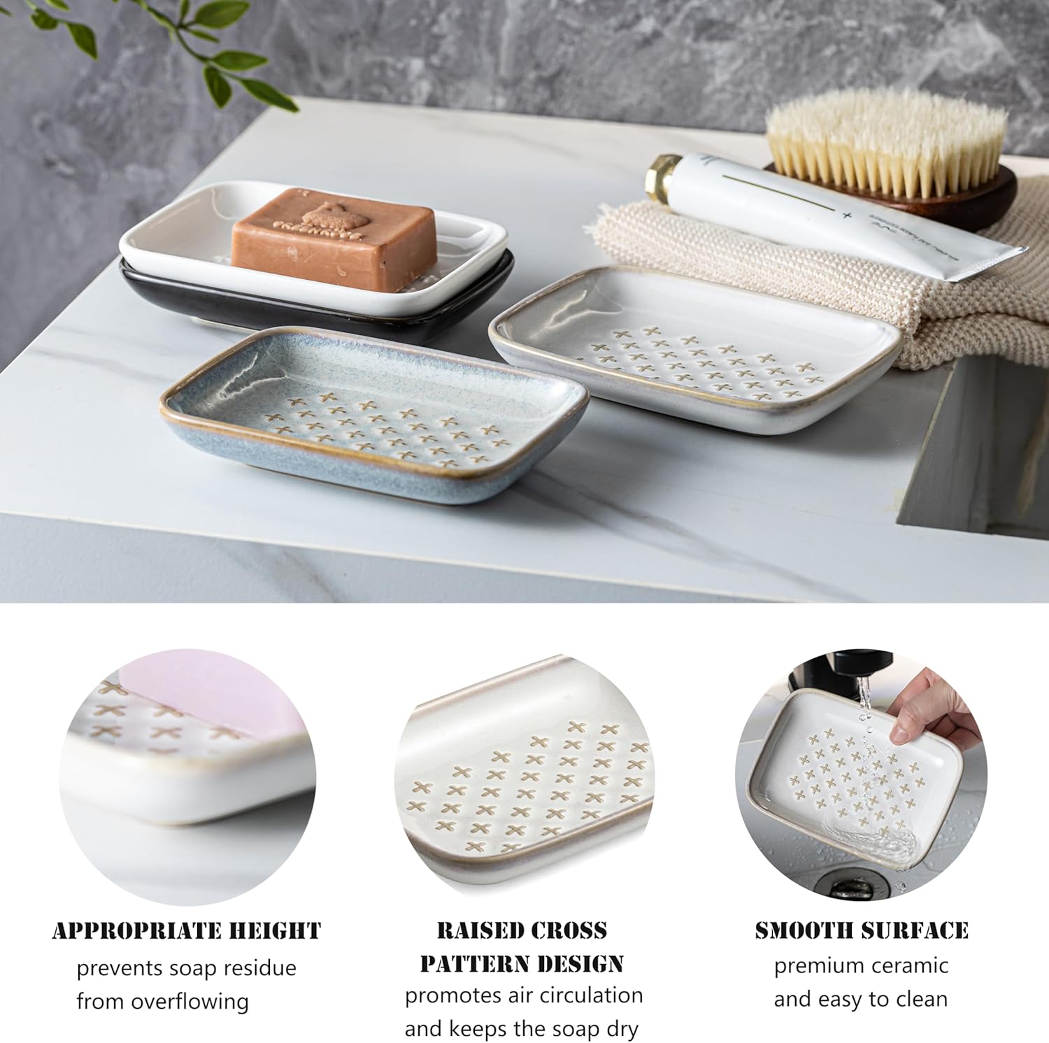 - UNIQUE CROSS PATTERNS DESIGN: Our soap tray featuring a soft beige finish and unique raised cross patterns not only adds to the aesthetic appeal but is also practical. This design ensures your soap remains in place, effectively helps drain water, and prevents it from pooling inside the soap dishes, thus keeping the soap dry and extending its service life.
