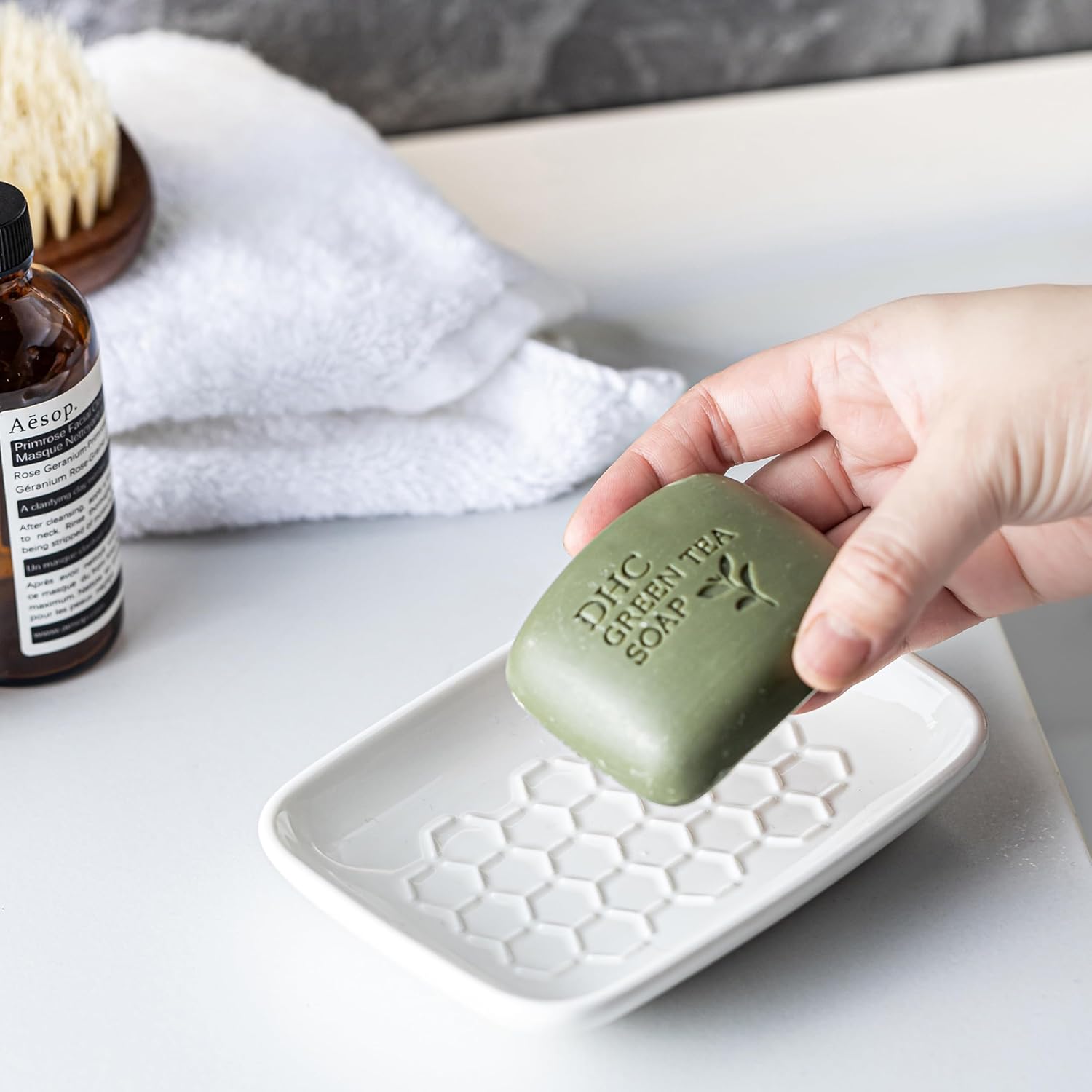 - NON-SLIP STABILITY: This bar soap holder offers excellent non-slip functionality. The raised honeycomb pattern on the inside holds the wet soap firmly in place, preventing it from slipping out of the tray. Its unglazed bottom ensures the stability of the ceramic soap dish and prevents the dish from accidentally slipping into the sink, making it ideal for use on bathroom and kitchen countertops.