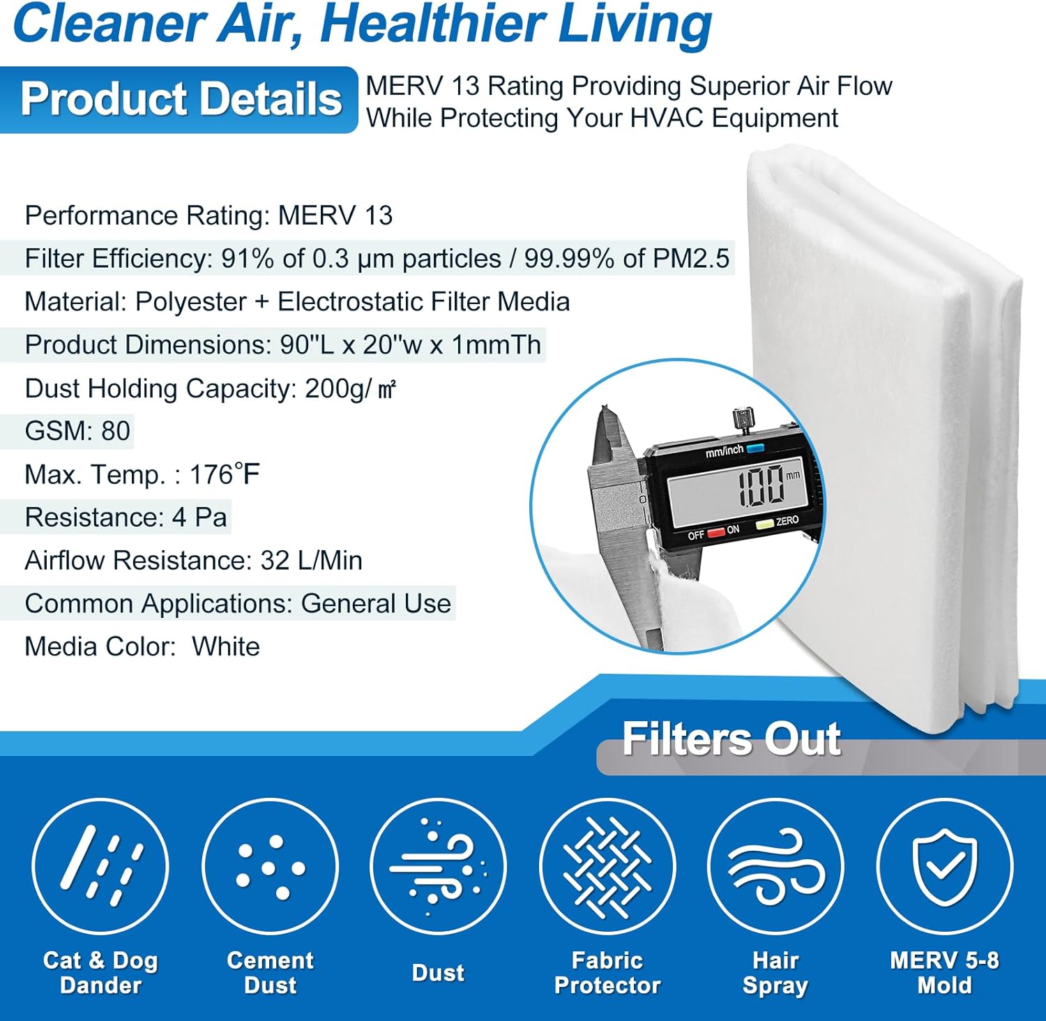- Effective Filtration - At just 1mm thick, our MERV 13 filtration with 91% filter rate for 0.3μm particles and 99.99% filter for PM2.5 which is better at filtering smaller particles like pet dander and pollen, reduce the presence of airborne particles, such as pet hairs, lint, dirt, invisible dust that may cause sneezing, coughing, and red itchy eyes. Save costs on frequent replacements, we recommend changing your AC vent pre-filter every 3 months or sonner.