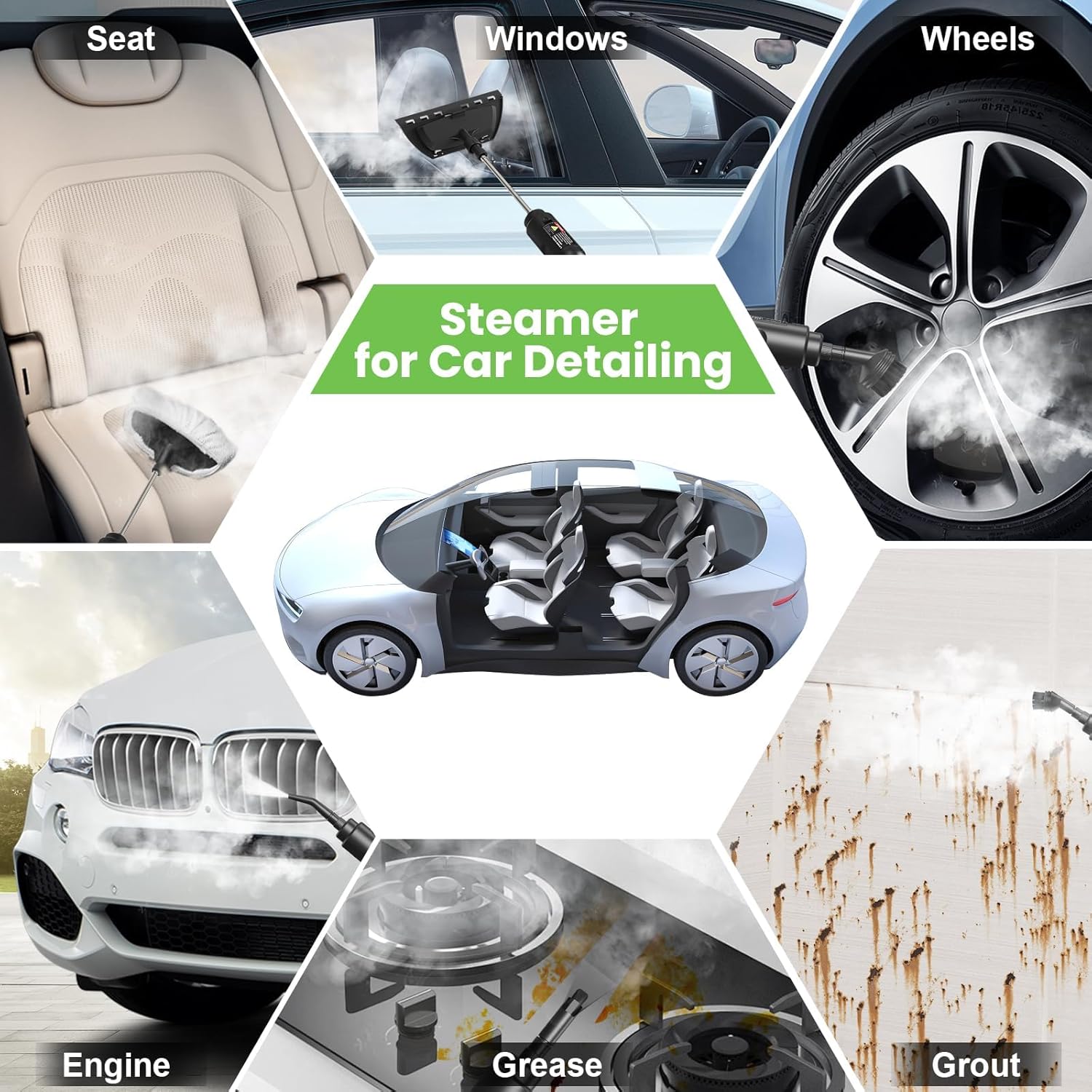 - Steamer Cleaner for All Surfaces: This steamer cleaner for all surfaces works on tile, grout, windows, car seats, kitchen hoods, upholstery, and more. Whether you're refreshing furniture, detailing your car, or cleaning your bathroom, it functions as a portable steam cleaner for all Surfaces