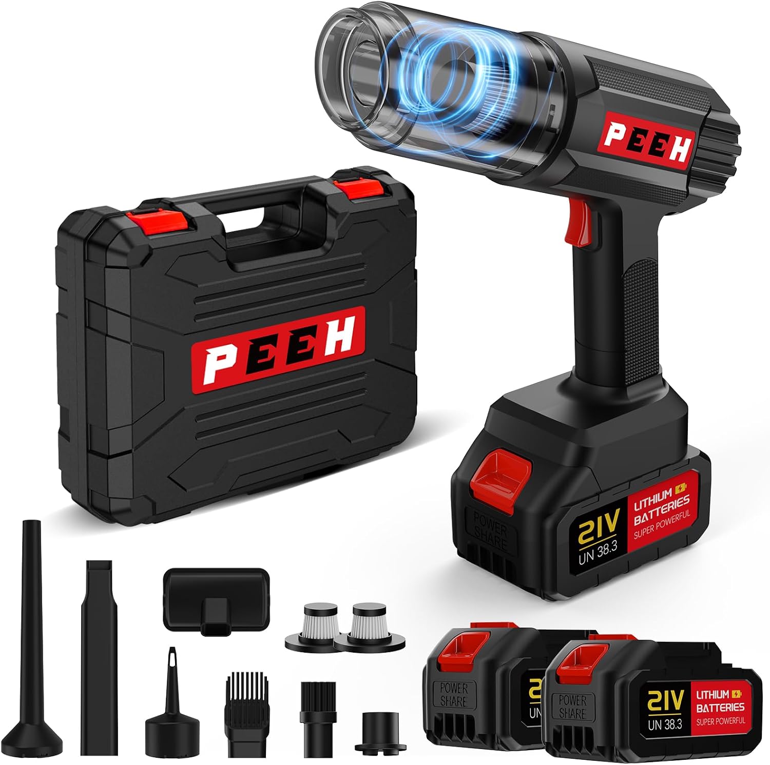 - HANDHELD VACUUM FOR HOME – PEEH Car vacuum cleaners come with six brush heads.Flat Suction Nozzle, Flat Brush, Round Brush, Long Inflation Nozzle, Multi-surface Nozzle, Air Suction Nozzle, Long Blower Nozzle. It can be used in a variety of scenarios.