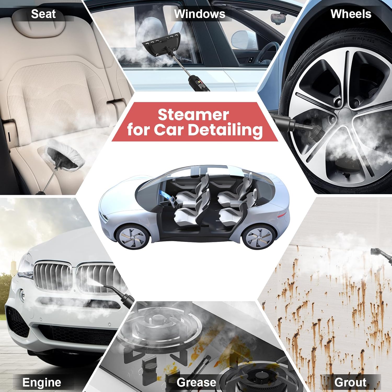- Steamer Cleaner for All Surfaces: This steamer cleaner for all surfaces works on tile, grout, windows, car seats, kitchen hoods, upholstery, and more. Whether you're refreshing furniture, detailing your car, or cleaning your bathroom, it functions as a portable steam cleaner for all Surfaces