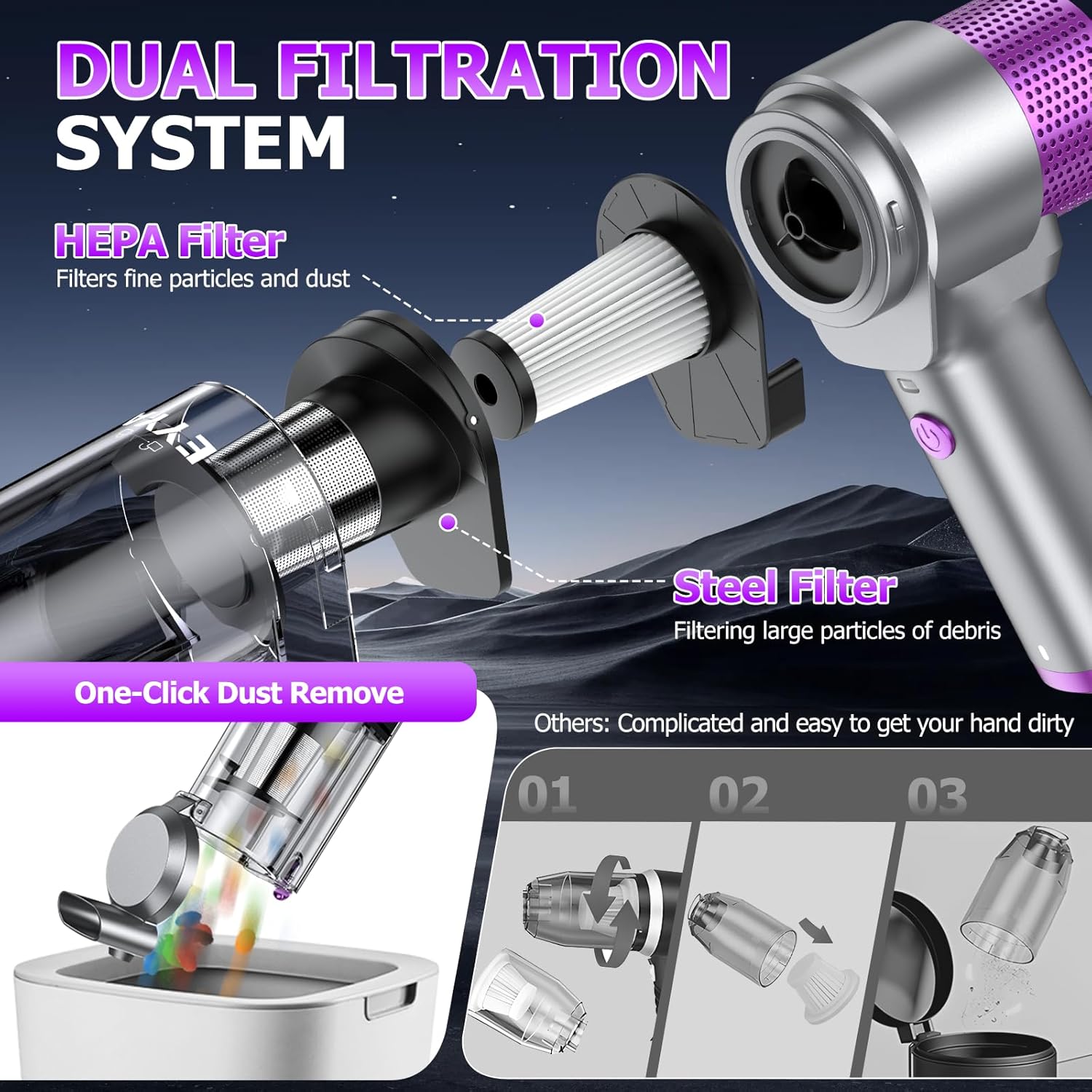- ➿【DUAL FILTRATION SYSTEM】Featuring a dual filtration system with 2 replaceable HEPA filters and an upgraded steel filter, handheld vacuum cordless cleaner effectively traps dust, hair, and 99% of fine particles, preventing clogs and maintaining powerful suction. The 200ML large capacity dust cup and unique top anti-trash escape design, you can use mini car vacuum cleaner with more worry, no need to worry that the trash will fall off during the work and need repeated cleaning