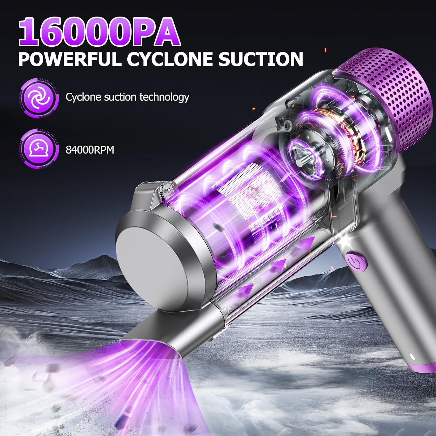 - 🌀【Powerful 16000PA Suction】Car vacuum cleaner is equipped with a 120W high power motor with a high motor speed of 84000RPM, providing a powerful suction of 16,000PA cyclone. It efficiently removes pet hair from sofa crevices, food crumbs on dining tables, and fine dust deep within carpets. Moreover, it maintains low noise level of 60dB while operating at high efficiency, making it suitable for use in homes, offices and cars