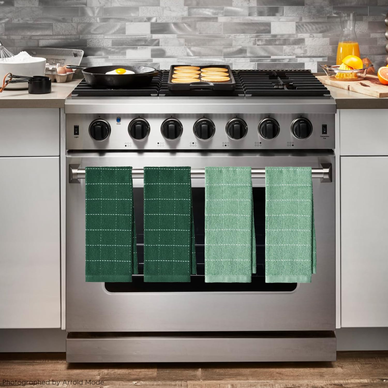 Artoid Mode Checkered Designed Cotton Dark Green Terry Kitchen Dish Towels, 15x25 Inch Soft Absorbent Quick Drying Cleaning Tea Towels Set of 4
