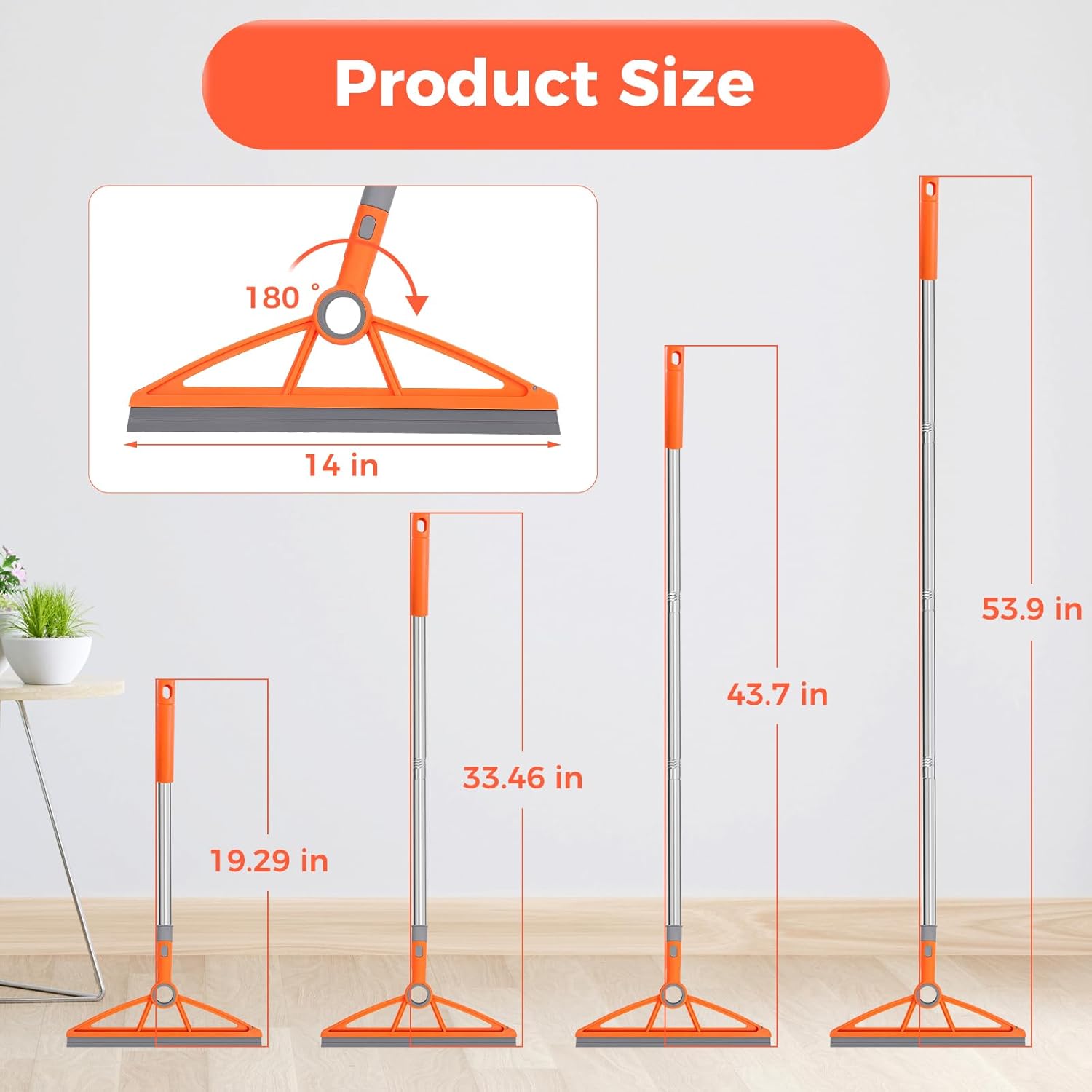 - 【180° Rotating Scraper】Our silicone rubber broom features a 180° rotating design, making it easy to clean hard-to-reach areas, including gaps, under sofas, beds, and along wall corners.The 53.7-inch adjustable handle can use no bending
