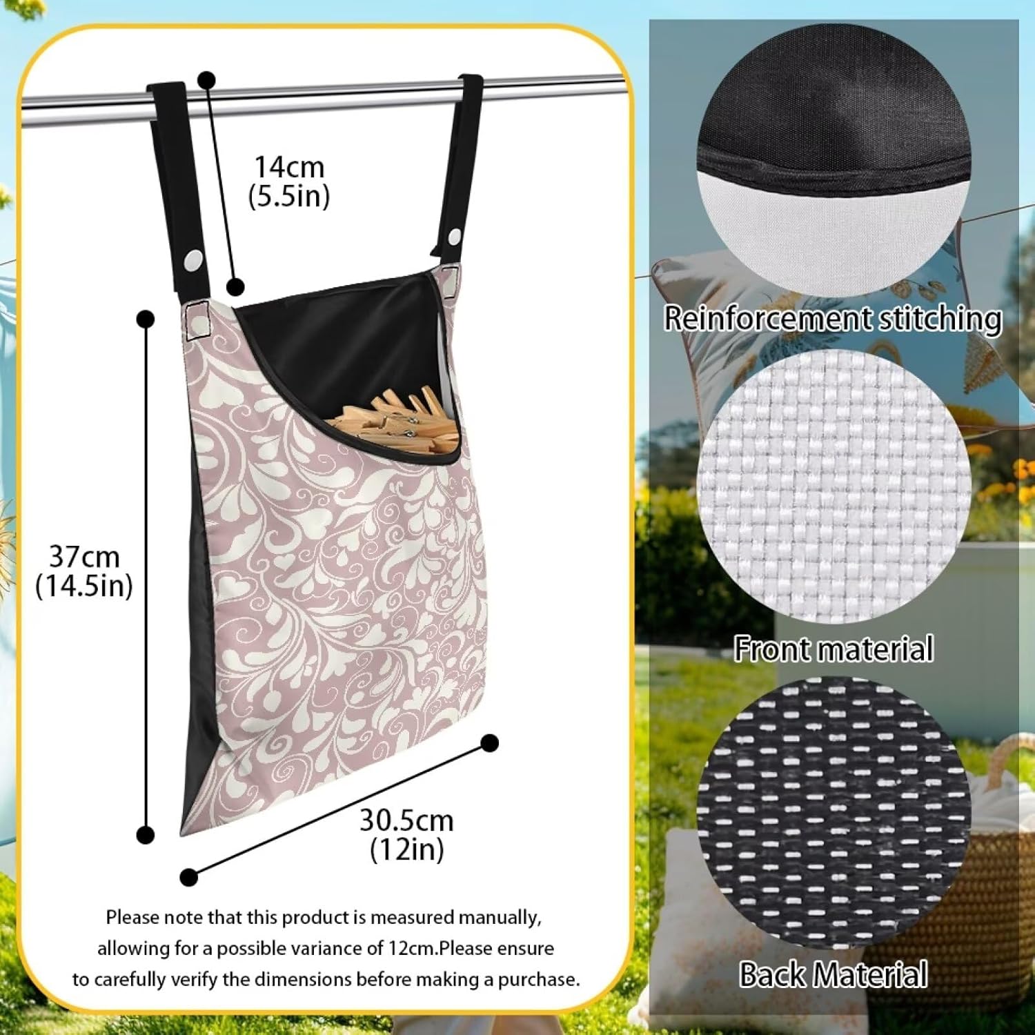High Capacity Clothespin Holder Bag 14.5x12 Inches - Durable Outdoor Storage with Wide Opening for Clothesline Organization Hanging Loop & Button Closure Heart Shape Floral Print Pink