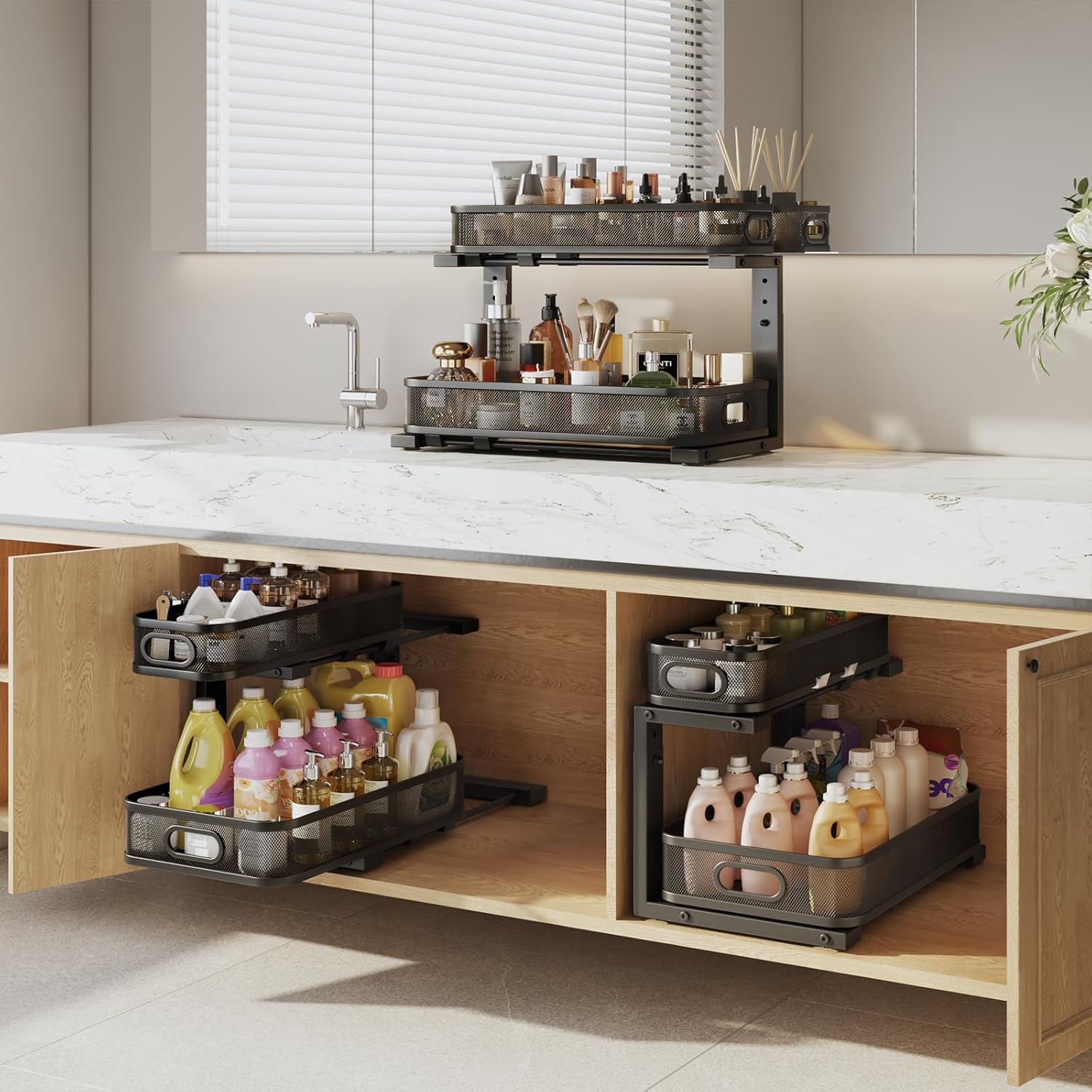 - 【Elegant Mesh Style,Refined Living】Designed with a graceful mesh structure,kitchen cabinet organizer is light,airy,and prevents small items from slipping—perfectly blending sleek and utility.