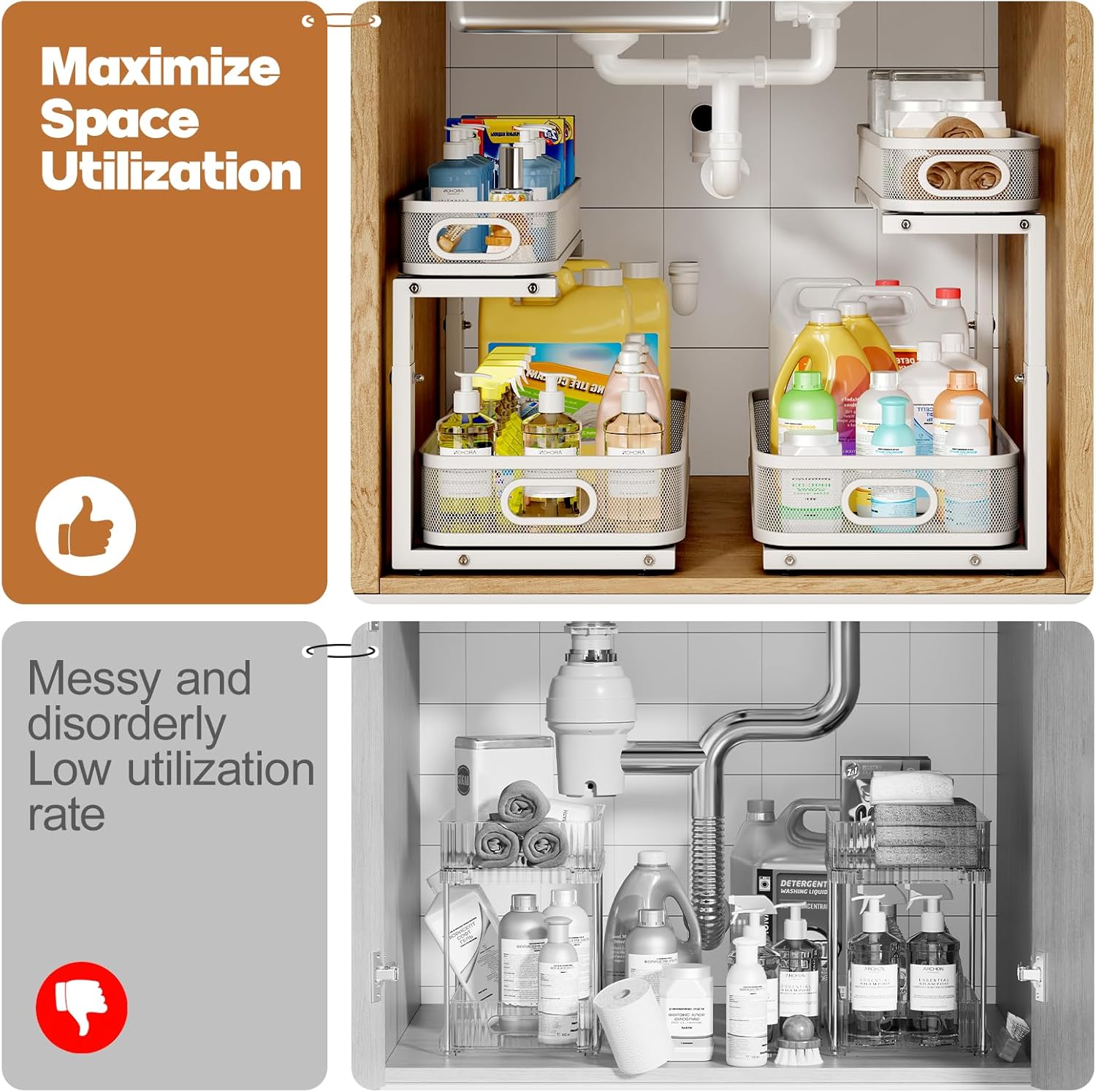 - 【Versatile Storage Solution】Designed with elegant mesh styling and double sliding tiers,undersink organizers blends seamlessly into any space—whether in the kitchen, bathroom,laundry,study,or living area.Perfect for storing seasonings,toiletries,books,or snacks,Sleek and functional.