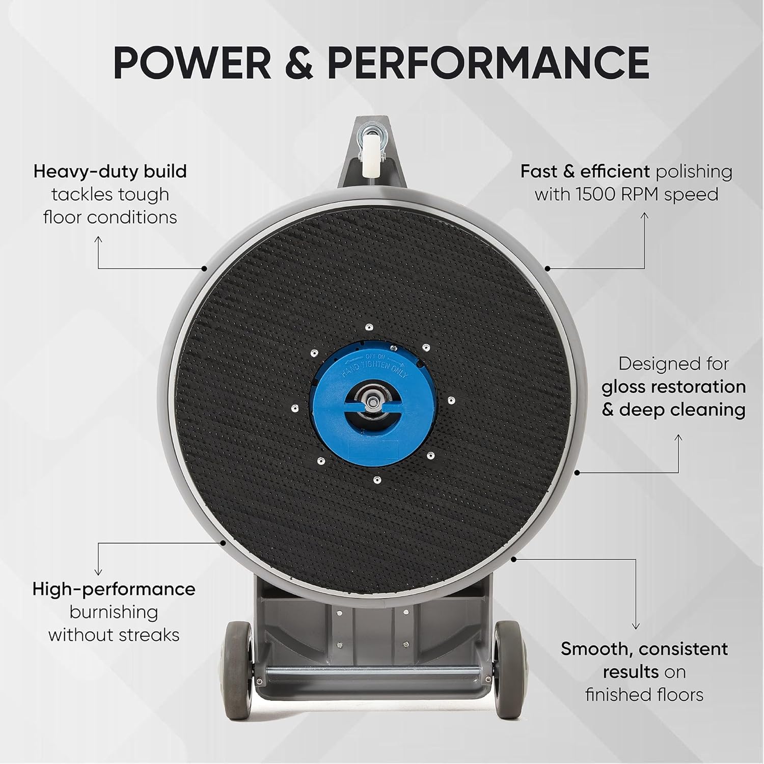 - POWERFUL HIGH-SPEED PERFORMANCE — Featuring a 1.5 peak horsepower, 1800-watt motor and spinning at 1500 RPM, this 20" commercial floor burnisher delivers fast, consistent results for polishing, cleaning, and restoring shine to finished floors in high-traffic areas.