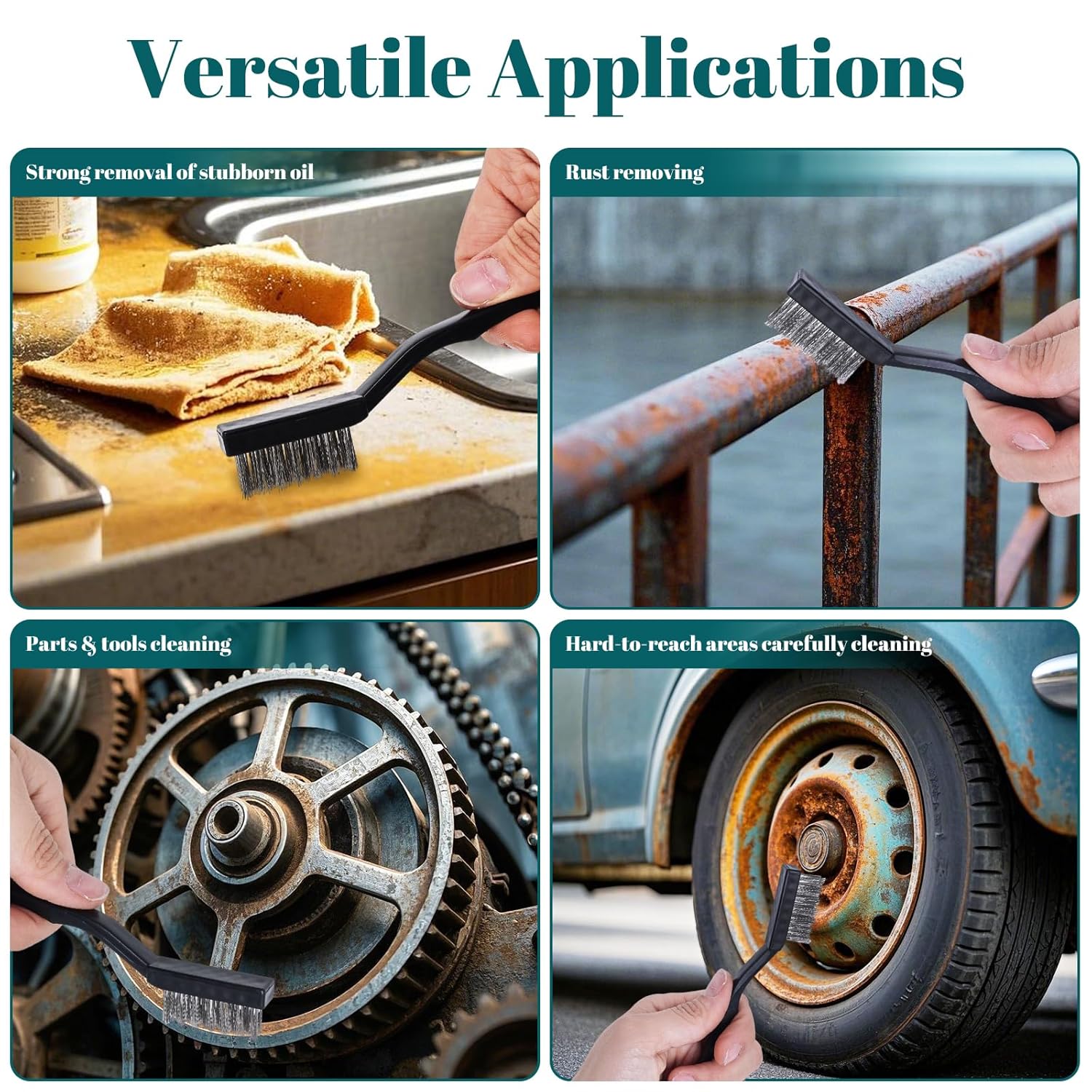 - 【Wide range of applications】: The stainless steel wire brush set is suitable for cleaning and descaling rust, machinery, metal parts, paint stains, welding slag, and will not damage the surface, and can also be efficiently used to clean kitchens, door frames, windows, floor tiles and other crevices