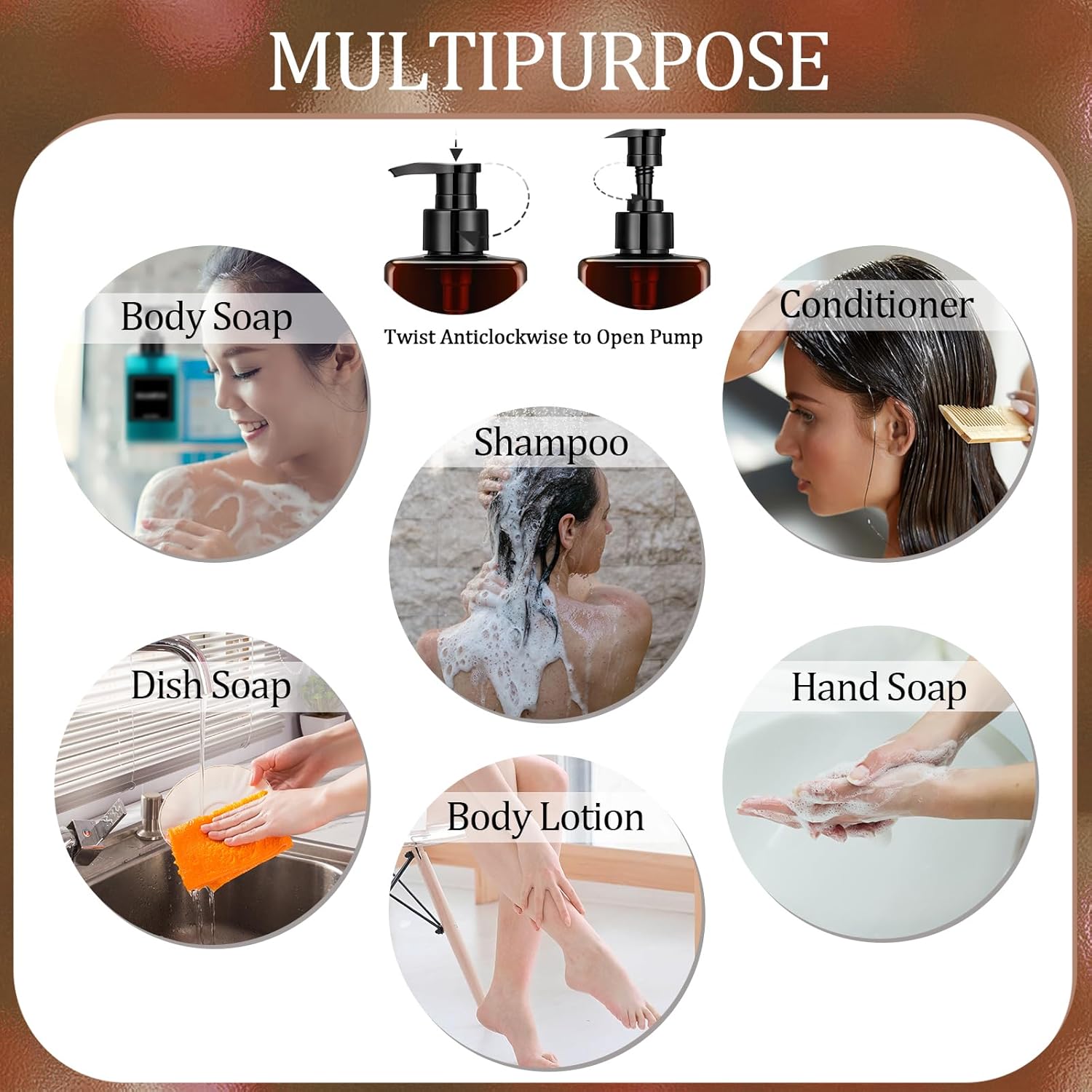 - Effortless to Apply: each shampoo pump dispenser is tall and skinny, adopts brown, looks clean and bright, easy for you to go well with other home decorations, and designed with a wide twisted mouth for you to refill the shampoo easily, a pump design can bring you a comfortable use experience