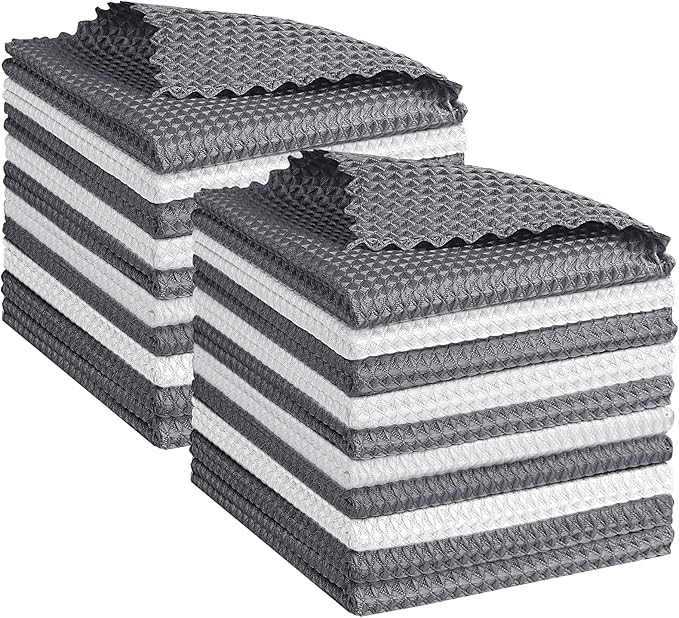 - Premium Microfiber & Waffle Weave Design: These Microfiber Cleaning Cloths feature a soft waffle weave texture that enhances surface contact for better cleaning. The waffle weave microfiber towel construction is lint-free, quick-drying, and effective at handling grease, water spots, and dust—helping your kitchen stay fresh and tidy after each use